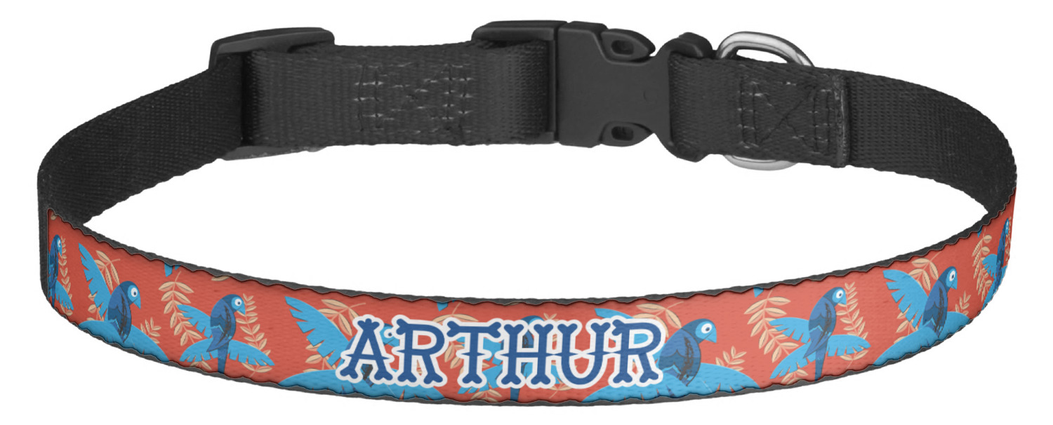This sturdy collar, made from a durable nylon weave, will outlive your dog's episodes of excited tugging and pulling. Courtesy of its thick plastic buckle and adjuster, this collar is adjustable and accommodating of any dog. Structurally, the collar is a single piece of nylon weave that is sewn together, and features a solid metal loop where you can attach a leash or dog tag. We print and display your dog's name and pattern across the middle of the personalized dog collar.