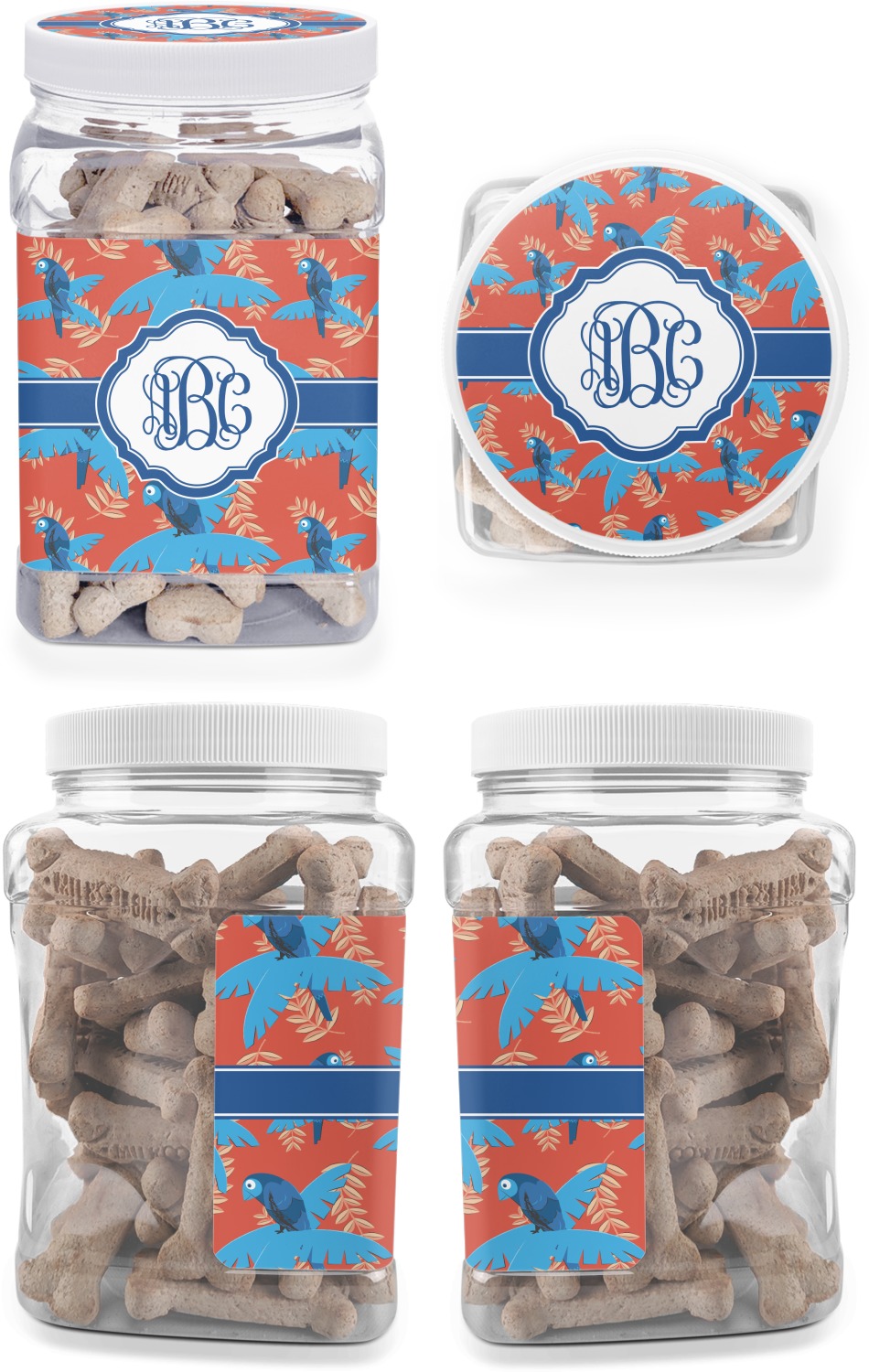 This half gallon jar, made from a sturdy plastic, is the perfect way to keep treats from any naughty pet paws, while still keeping them ready on hand for when your pup performs an impressive trick. This dog cookie jar features a screw-on, white lid that displays your personalized design on a vinyl sticker. We apply another customized sticker that wraps around the front and sides of the jar. Our dog treat jar also has indentations on the rear ends of the sides, which allows for convenient handling, and its square frame allows for easy storage.