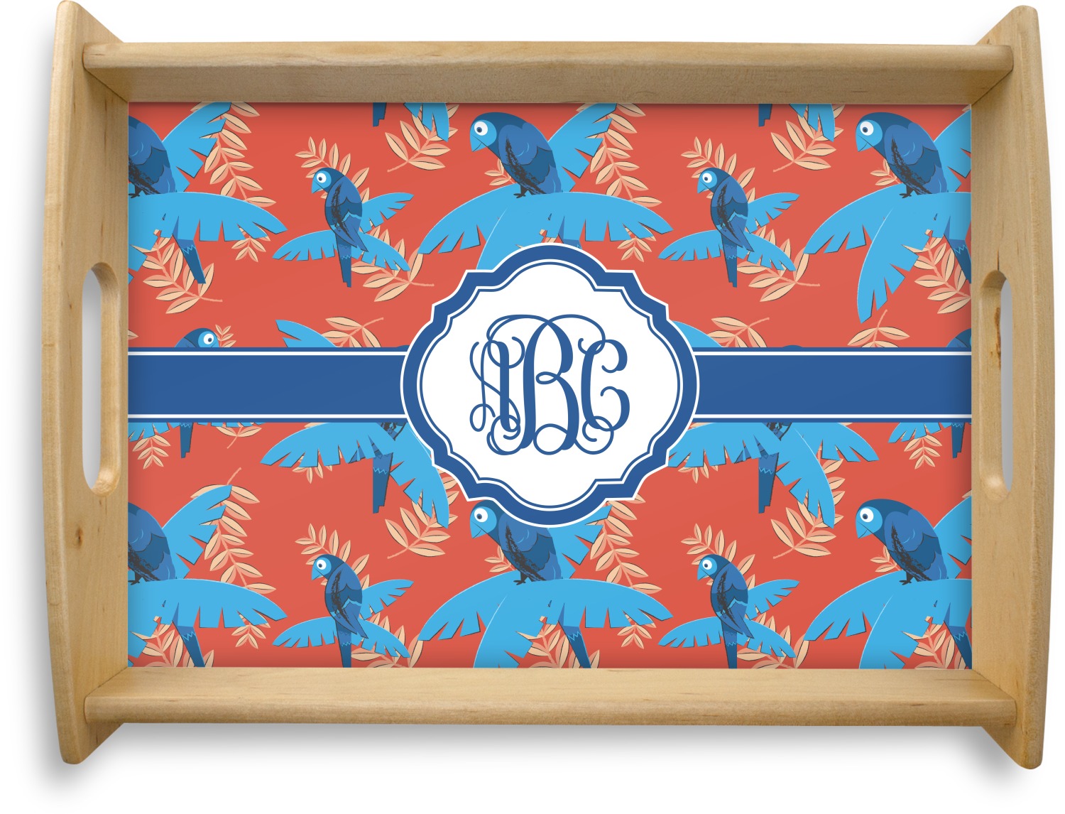 This serving tray with handles features square edges and two rounded sides, creating a very modern look. Each side is fabricated from a beautifully cut, natural wood. The bottom of the interior of the tray displays your customized design in bright, vibrant color. The tray is sold in both a black color and a natural wood look. Each variation of the wood serving tray has two sizes: Small, which is 14" x 10" x 2.25", and Large, which is 19.5" x 13.5" x 2.75".