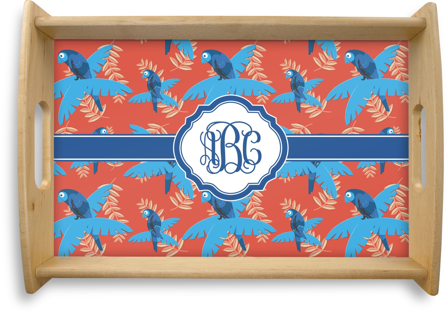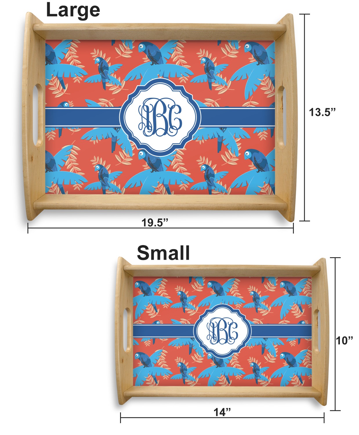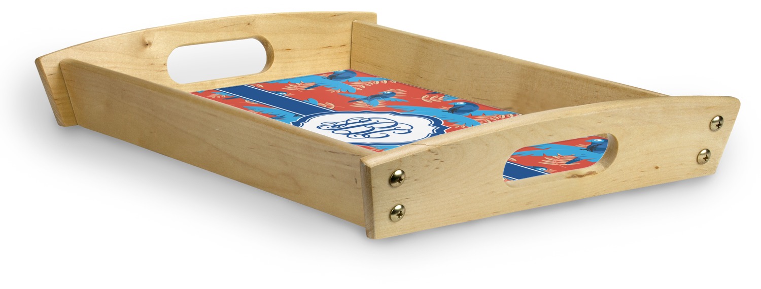 This serving tray with handles features square edges and two rounded sides, creating a very modern look. Each side is fabricated from a beautifully cut, natural wood. The bottom of the interior of the tray displays your customized design in bright, vibrant color. The tray is sold in both a black color and a natural wood look. Each variation of the wood serving tray has two sizes: Small, which is 14" x 10" x 2.25", and Large, which is 19.5" x 13.5" x 2.75".