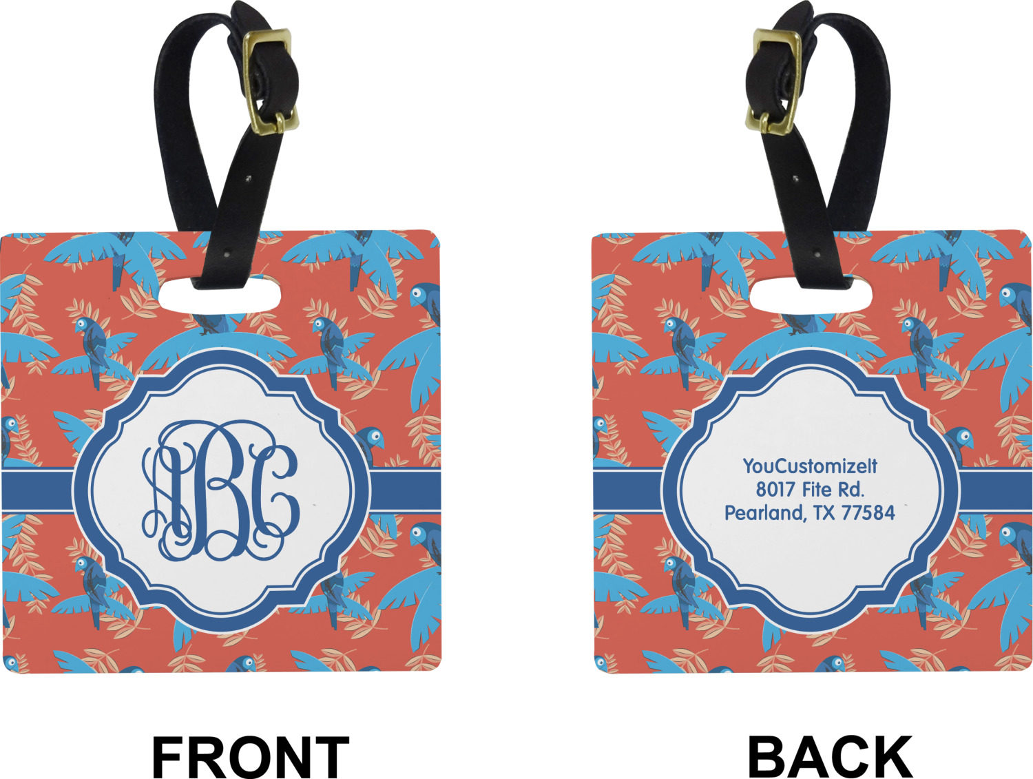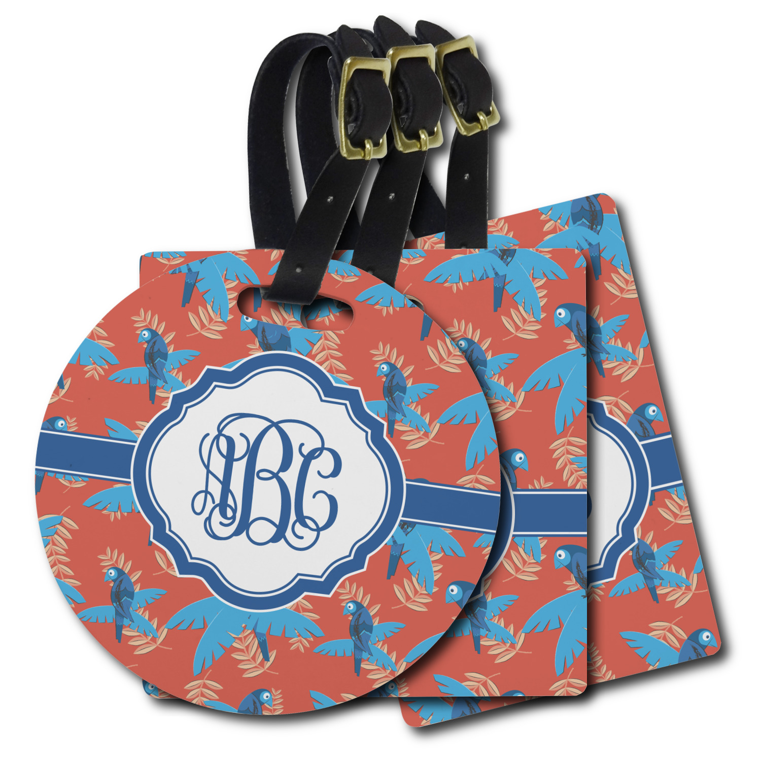 These personalized bag tags are sold in a variety of shapes, so that you may find the product that meets your vision exactly. We sell a round luggage tag, which measures at approximately 4" x 4". Our square luggage tag is about 3.5" x 3.5", while our rectangular version is 2.75" x 4 ".