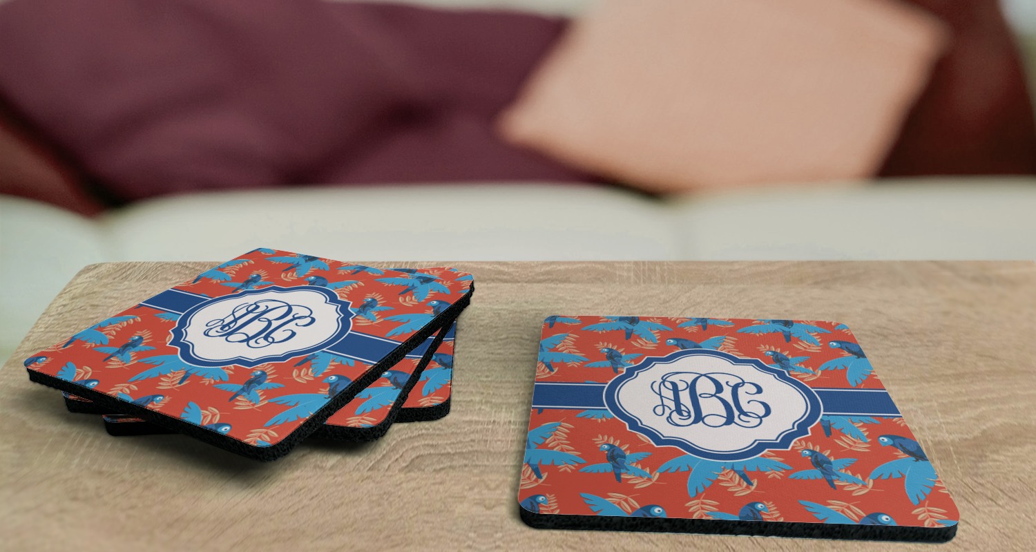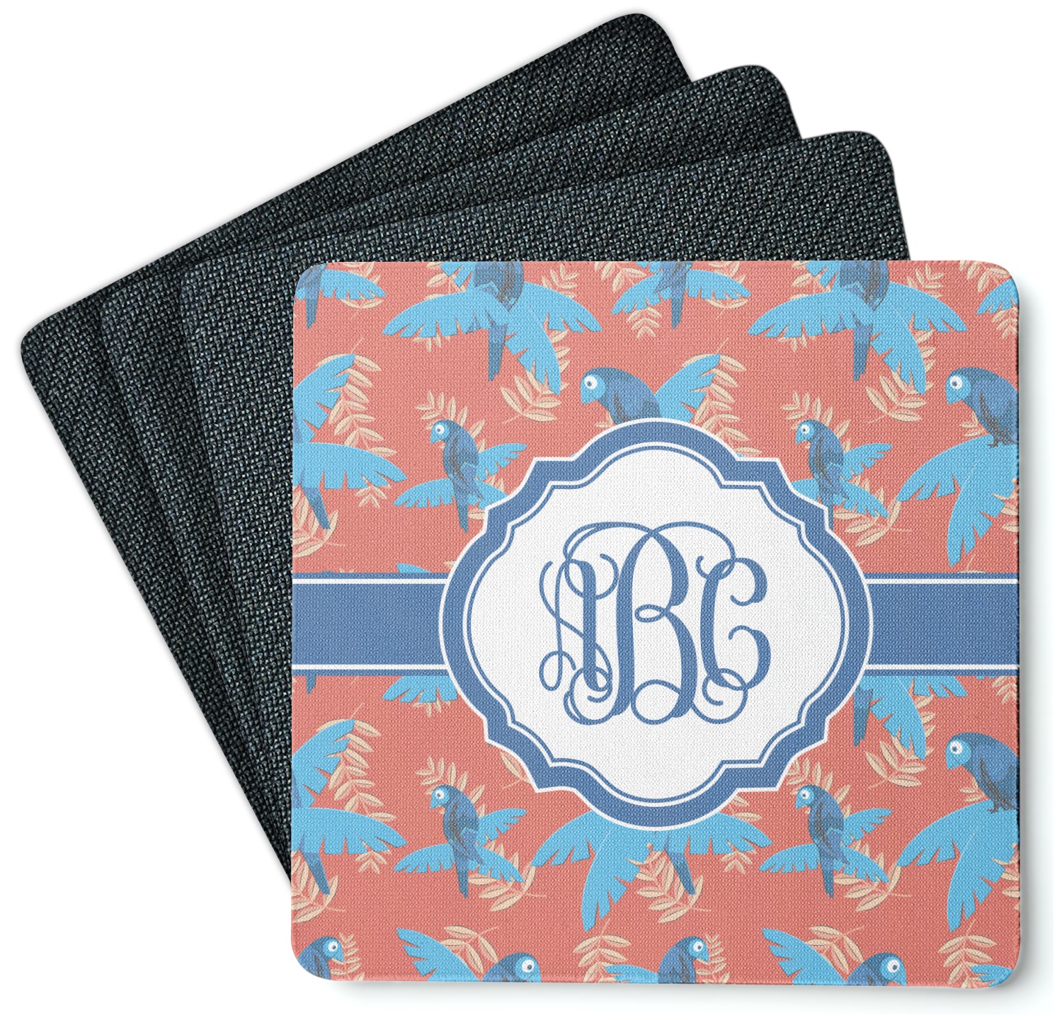 These drink coasters have a smooth, polyester top and a textured, rubber backing on its bottom. The non-slip rubber backing underneath works to keep any spills at bay. At 4 by 4 by 0.25 inches thick, these custom coasters are a suitable size for most drinkware. Your personalization is displayed atop the face of the cup coaster. We sell these rubber coasters in two different shapes: square and round. You can buy each shape as singulars or as a set of 4.