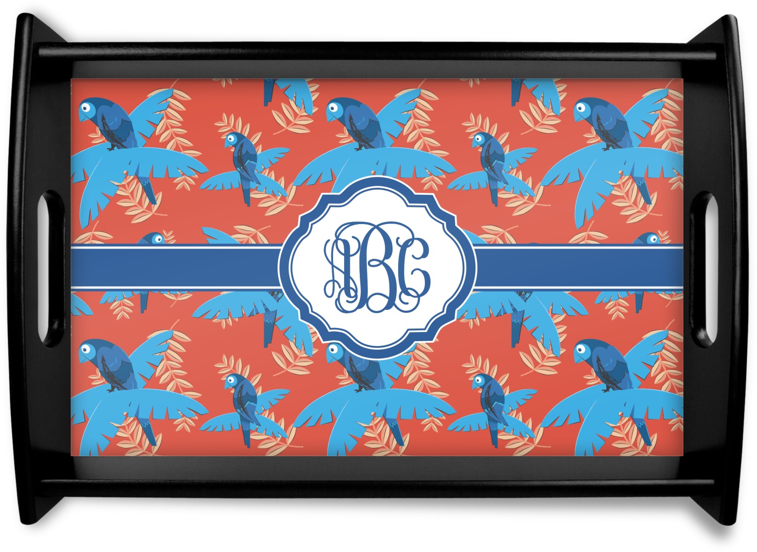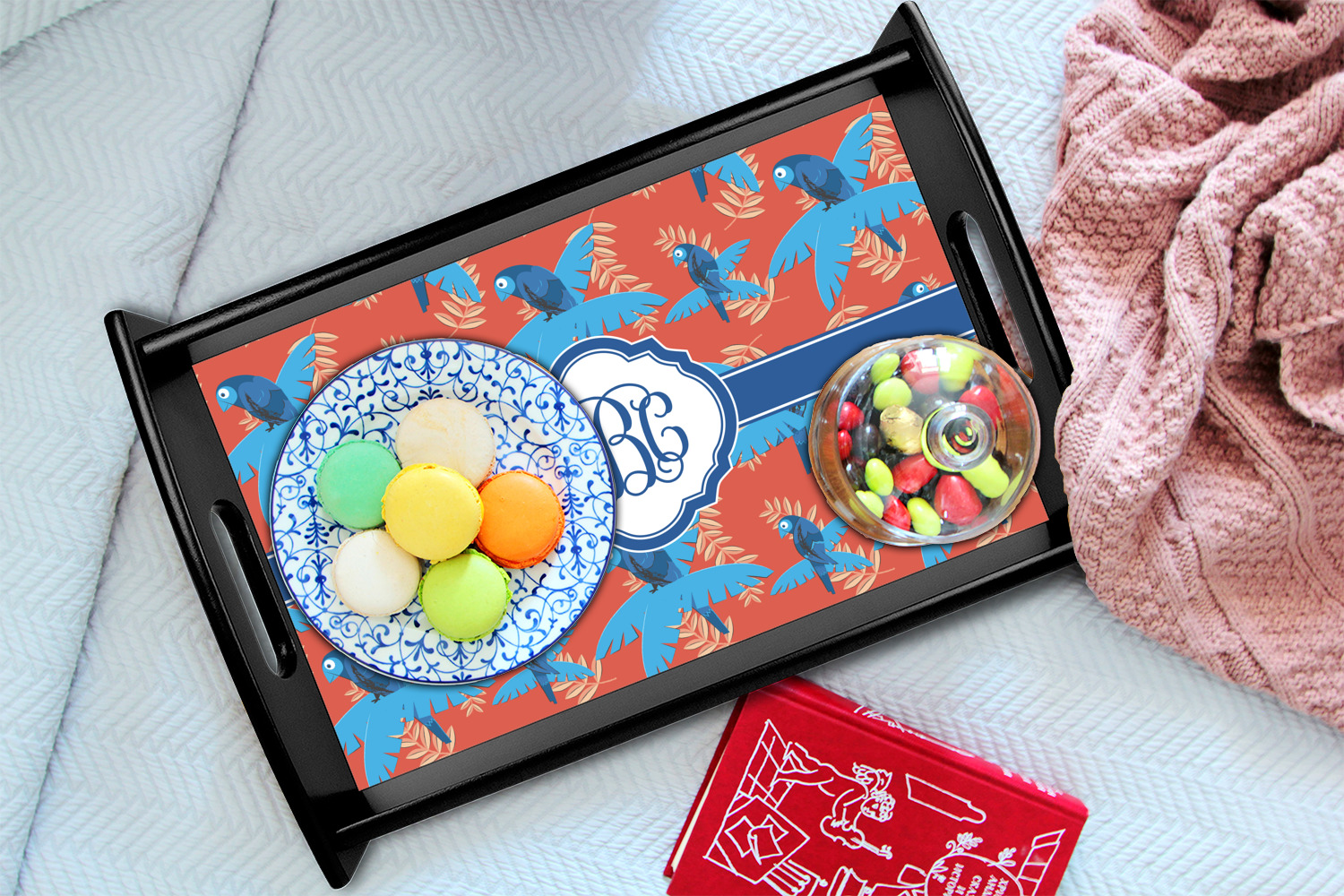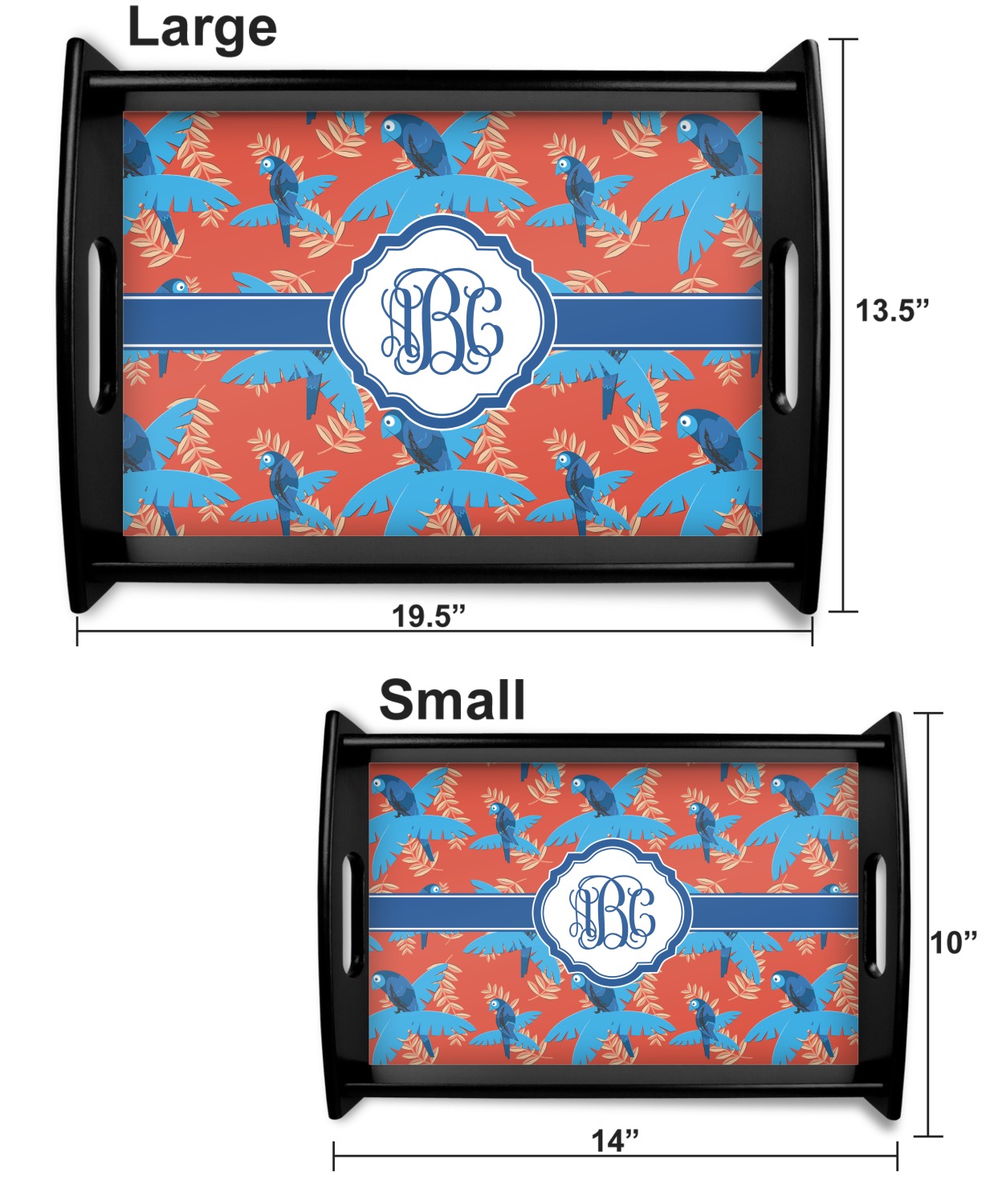 This serving tray with handles features square edges and two rounded sides, creating a very modern look. Each side is fabricated from a beautifully cut, natural wood. The bottom of the interior of the tray displays your customized design in bright, vibrant color. The tray is sold in both a black color and a natural wood look. Each variation of the wood serving tray has two sizes: Small, which is 14" x 10" x 2.25", and Large, which is 19.5" x 13.5" x 2.75".