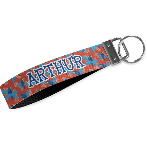 These key fob keychains are made from a polyester weave, right here in the USA. They feature a silver, metal clasp, attached to a round keyring. The piece gives the personalized wristlet a beautiful, finished look. Your customized design is printed on the outside of the keychain strap. We carry these wristlets in two sizes: small, which is 5 inches in width, and large, which is 5.5 inches in width.