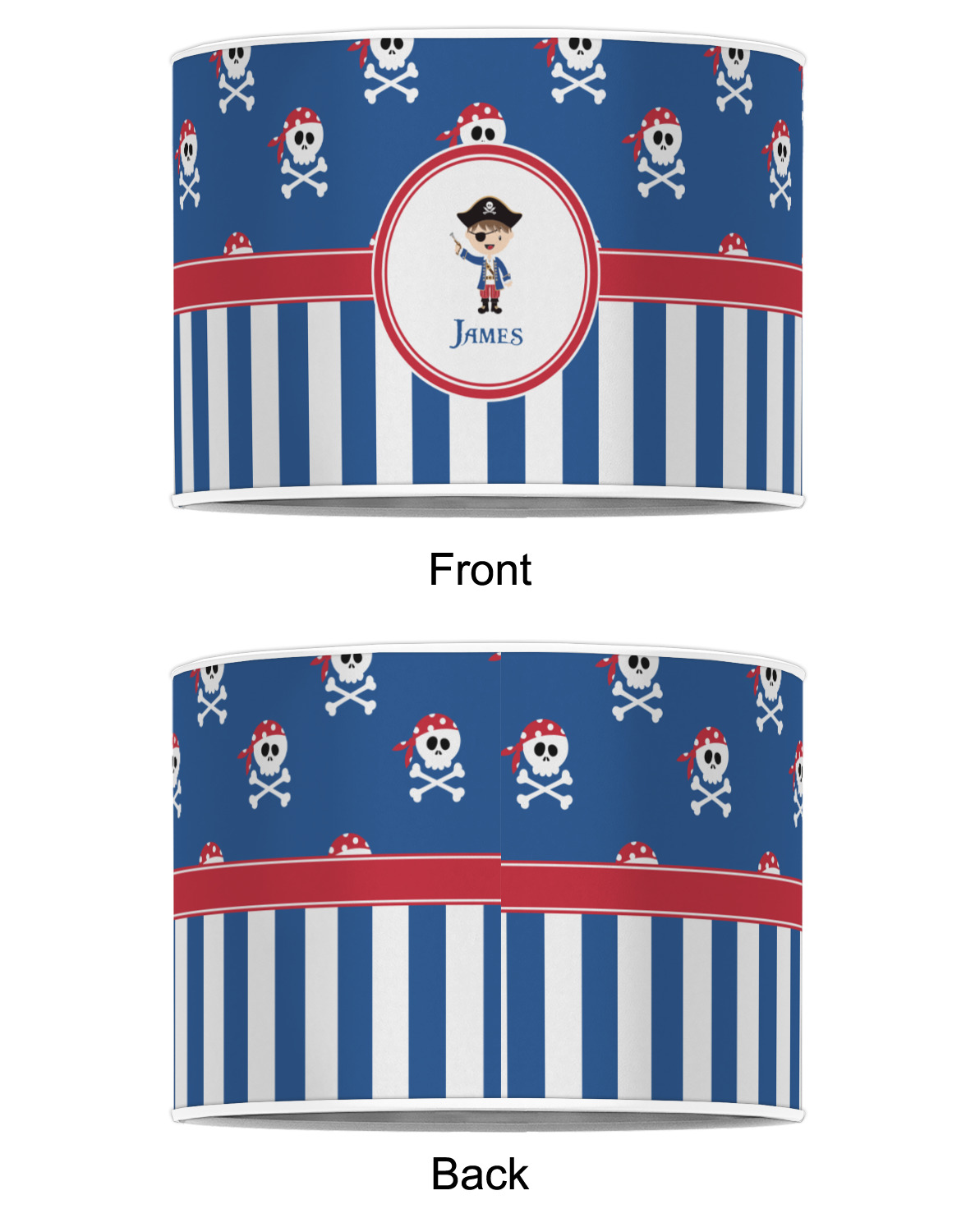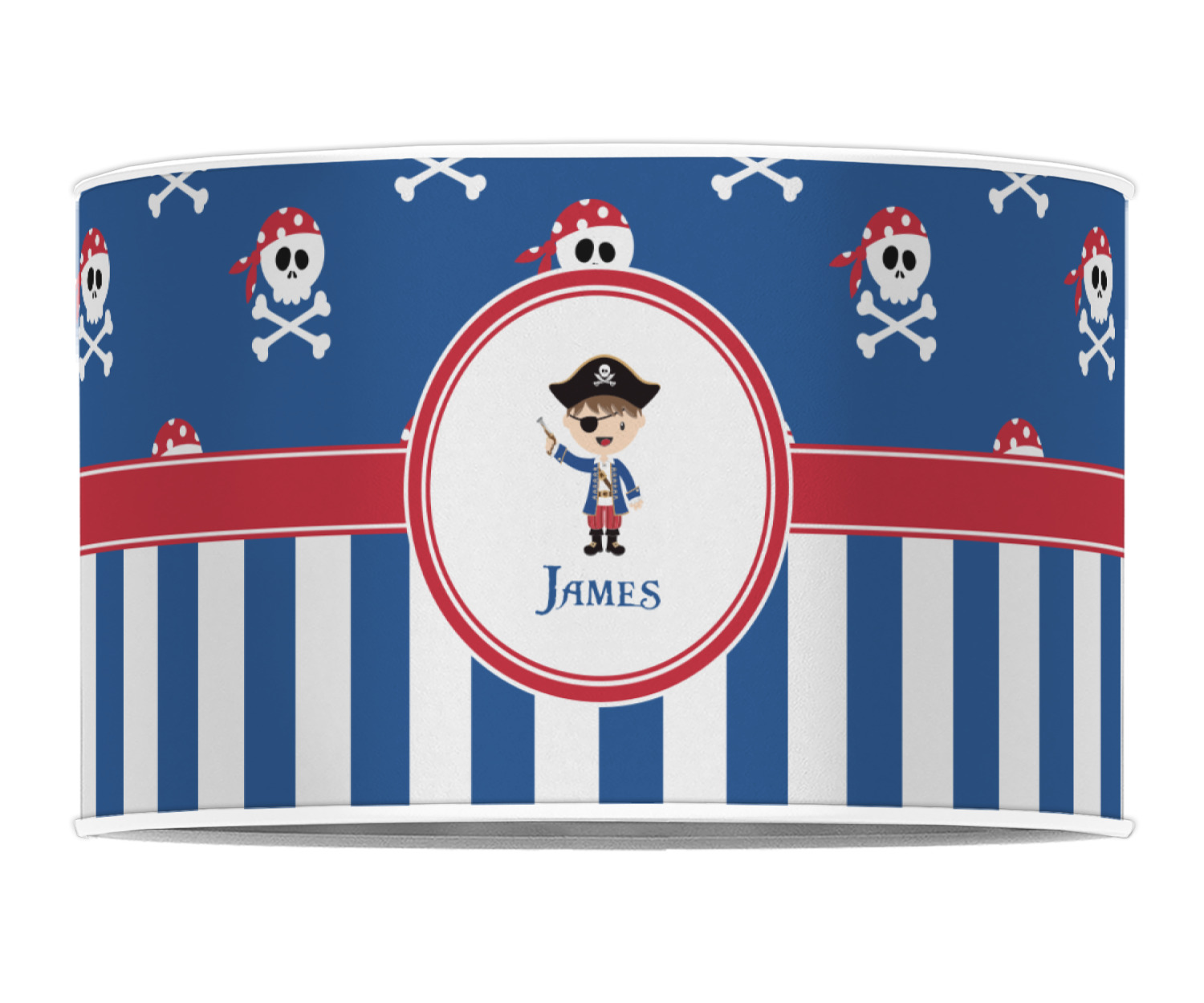 A wide band of red, trimmed in white highlight the pirate boy in the circle label. Add your personalization in the label to complete the look.