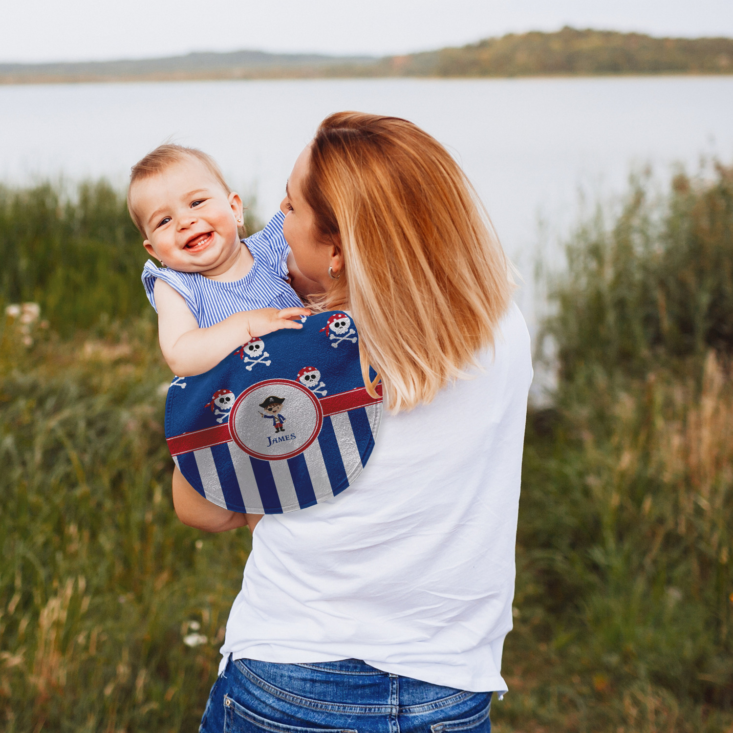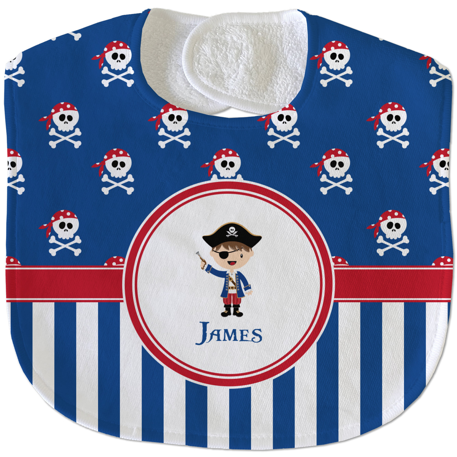 A wide band of red, trimmed in white highlight the pirate boy in the circle label. Add your personalization in the label to complete the look.