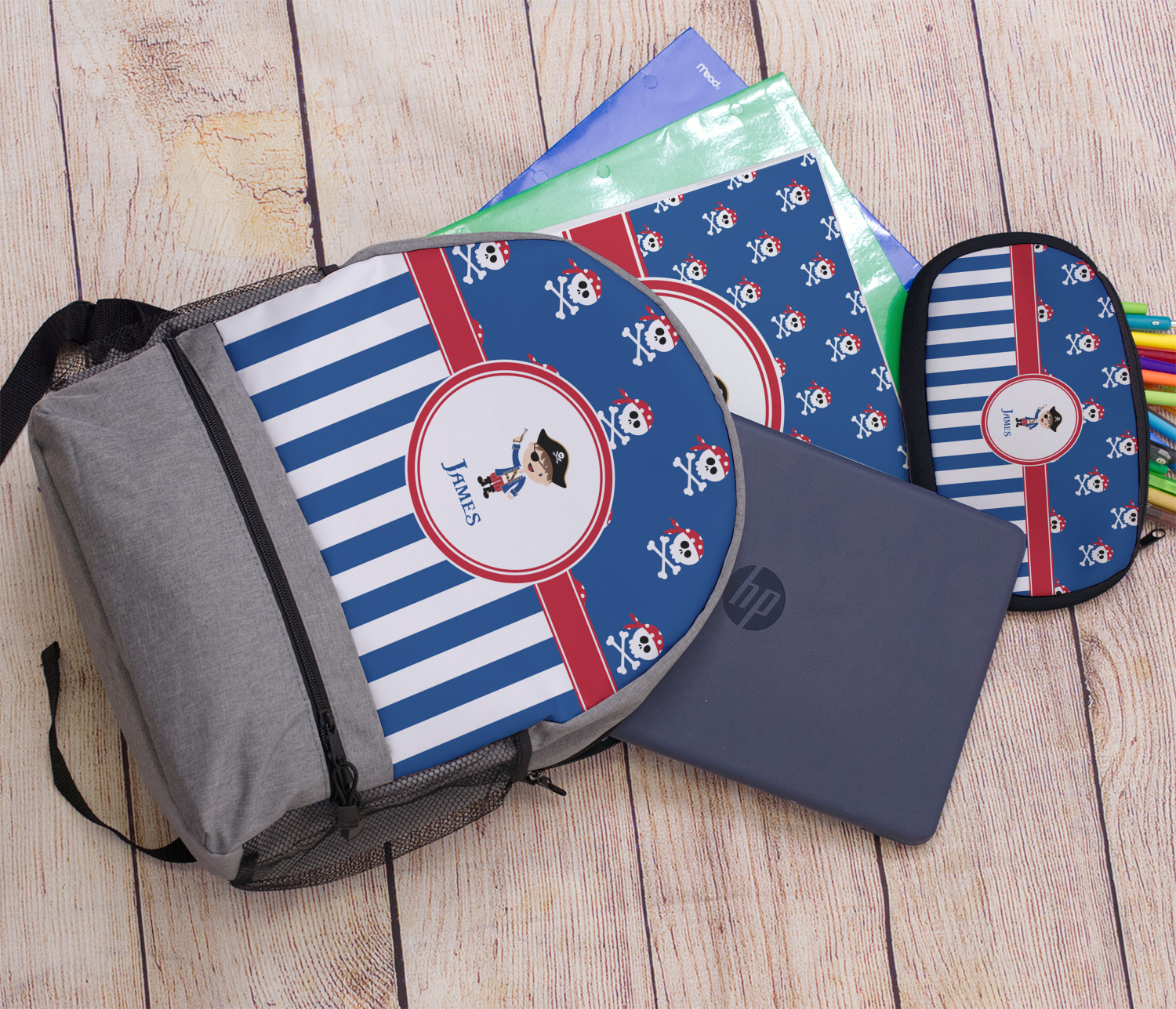 A wide band of red, trimmed in white highlight the pirate boy in the circle label. Add your personalization in the label to complete the look.