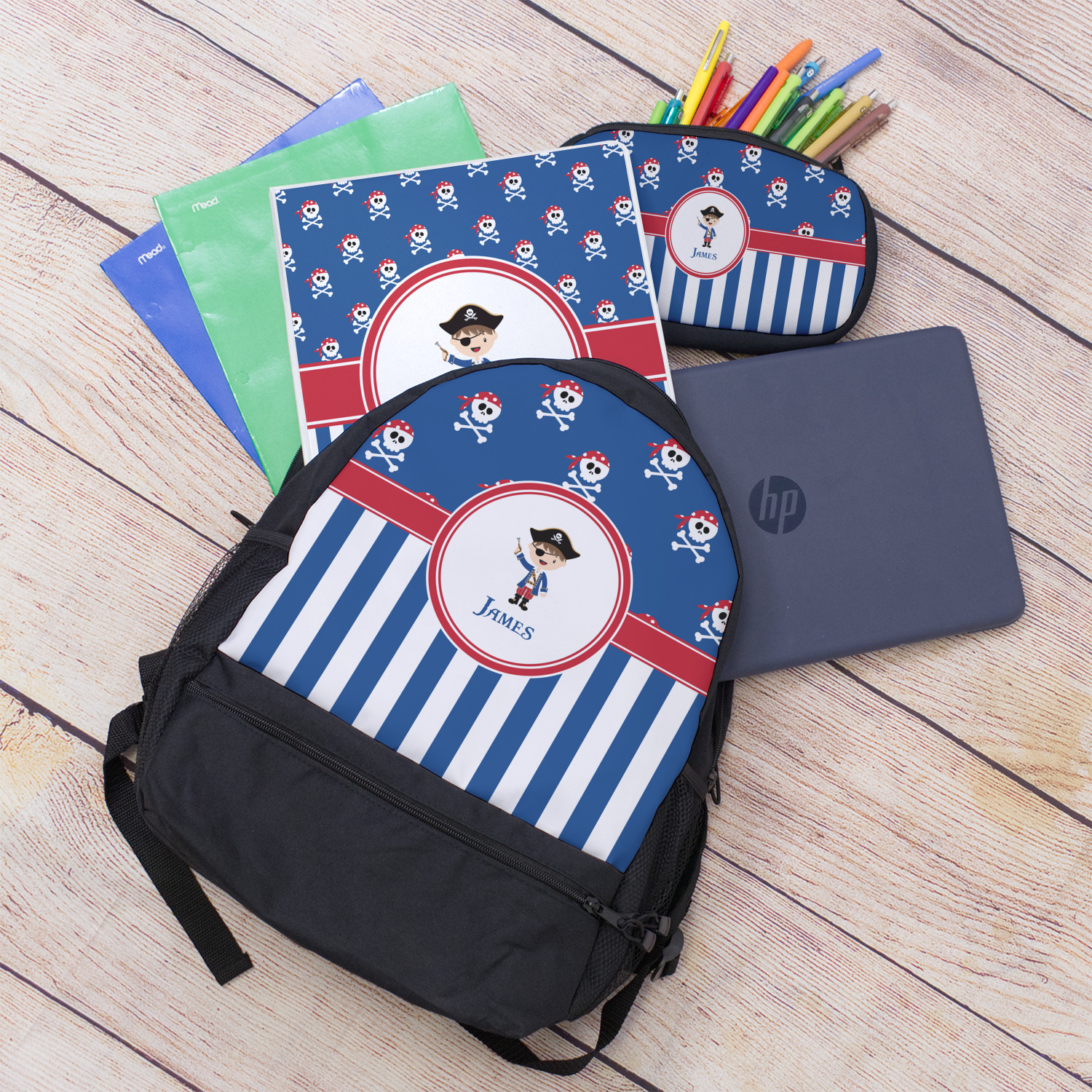 A wide band of red, trimmed in white highlight the pirate boy in the circle label. Add your personalization in the label to complete the look.