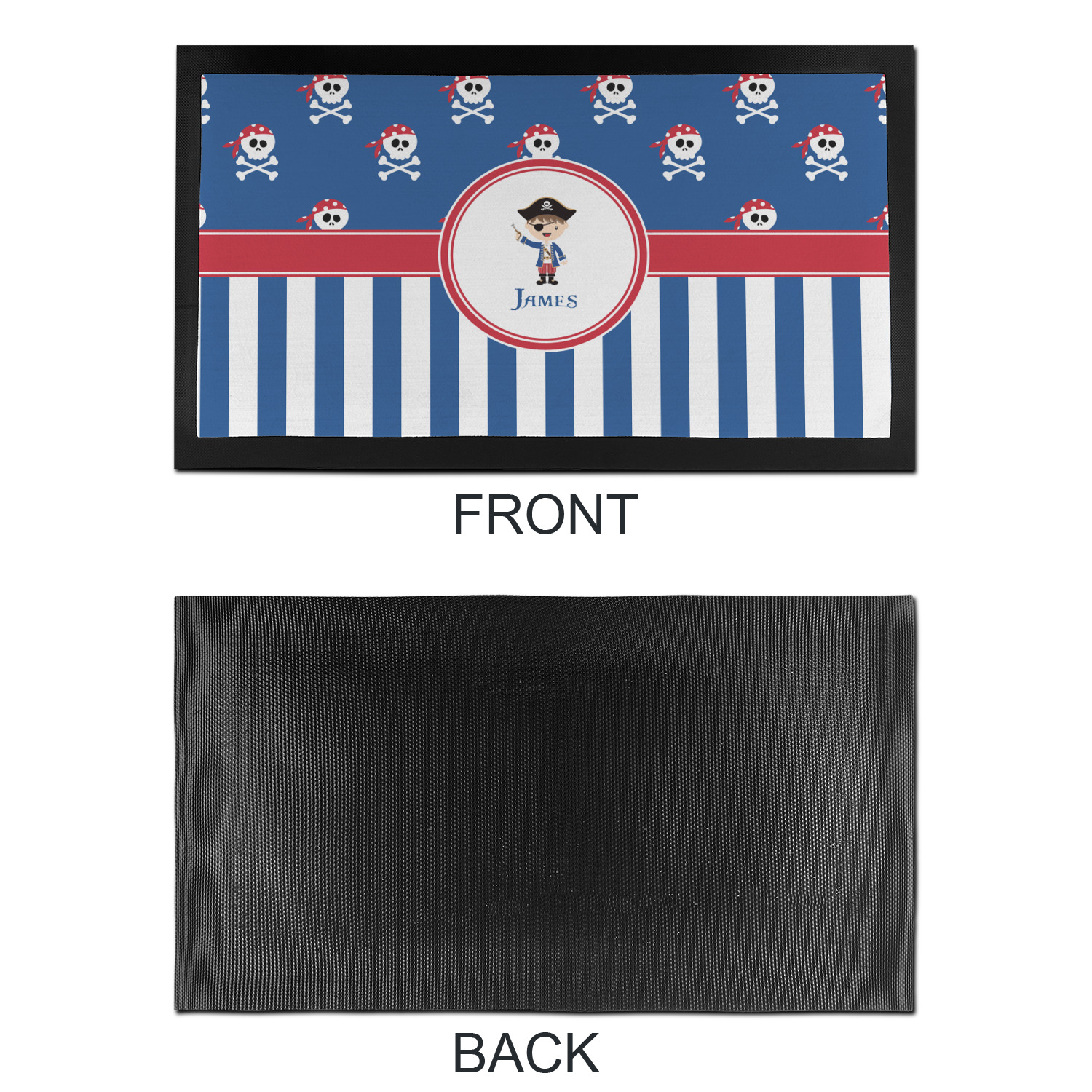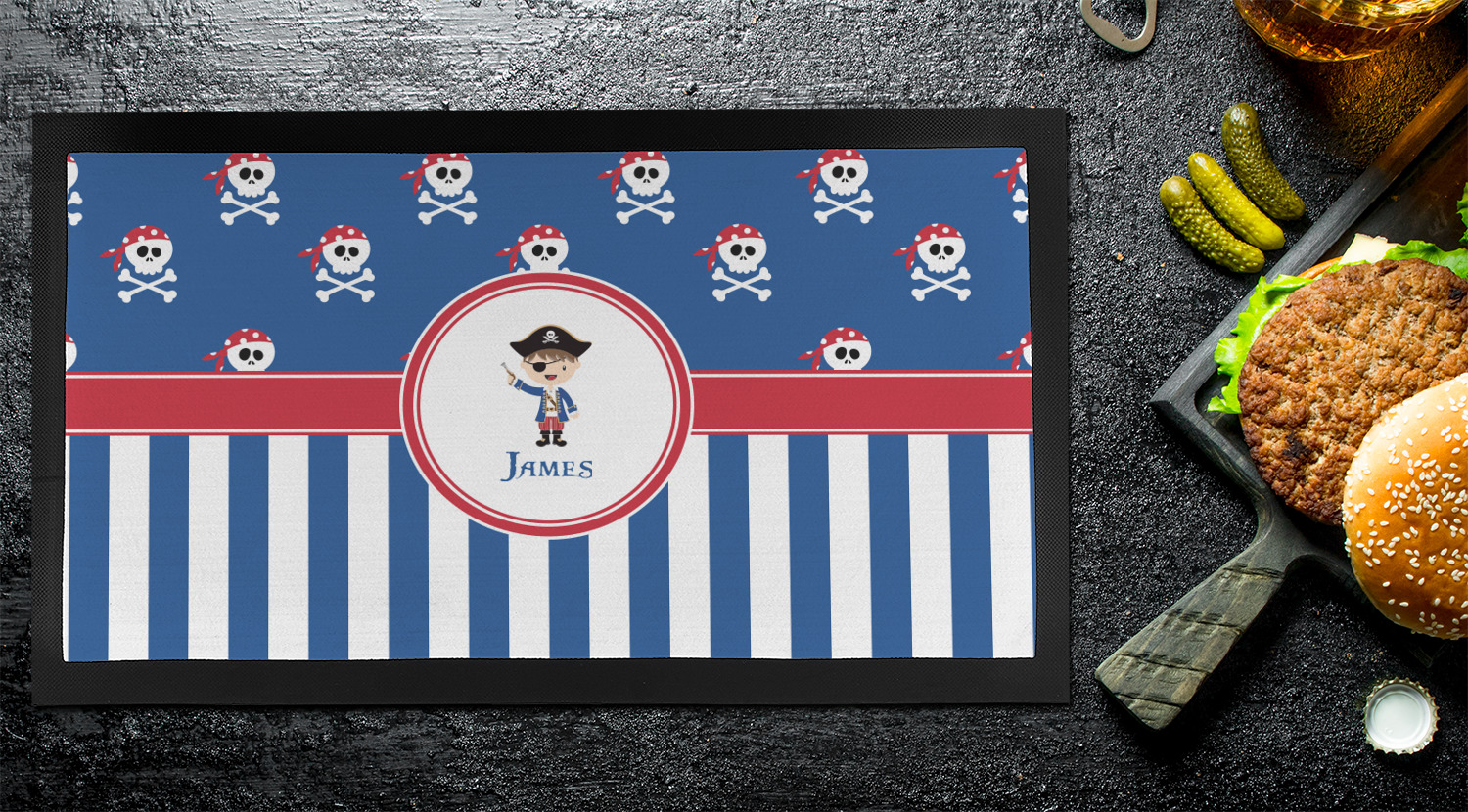 A wide band of red, trimmed in white highlight the pirate boy in the circle label. Add your personalization in the label to complete the look.