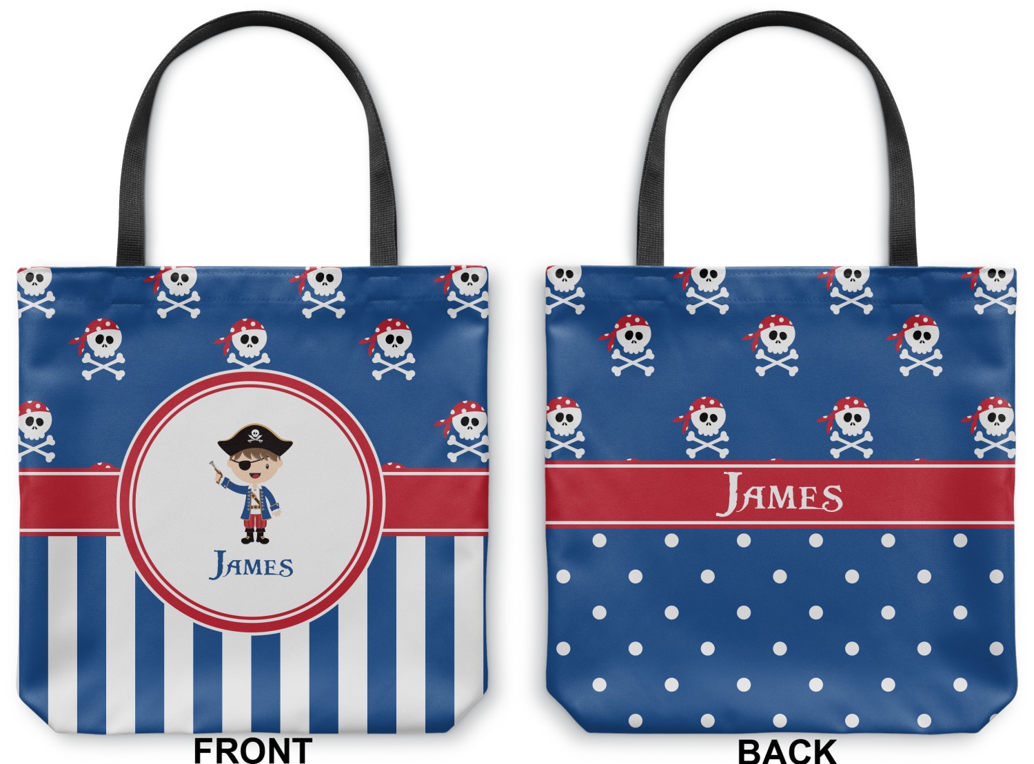 A wide band of red, trimmed in white highlight the pirate boy in the circle label. Add your personalization in the label to complete the look.