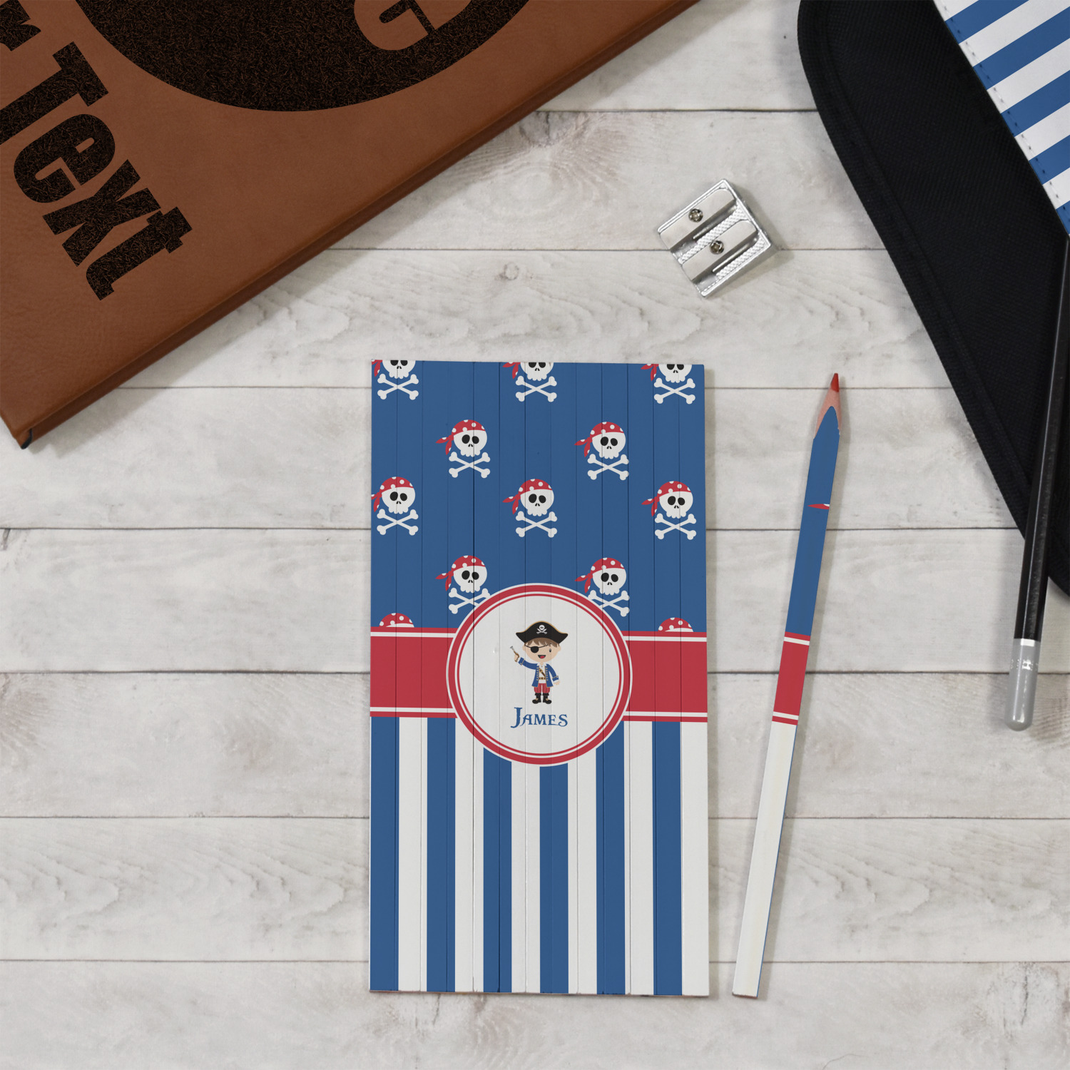 A wide band of red, trimmed in white highlight the pirate boy in the circle label. Add your personalization in the label to complete the look.