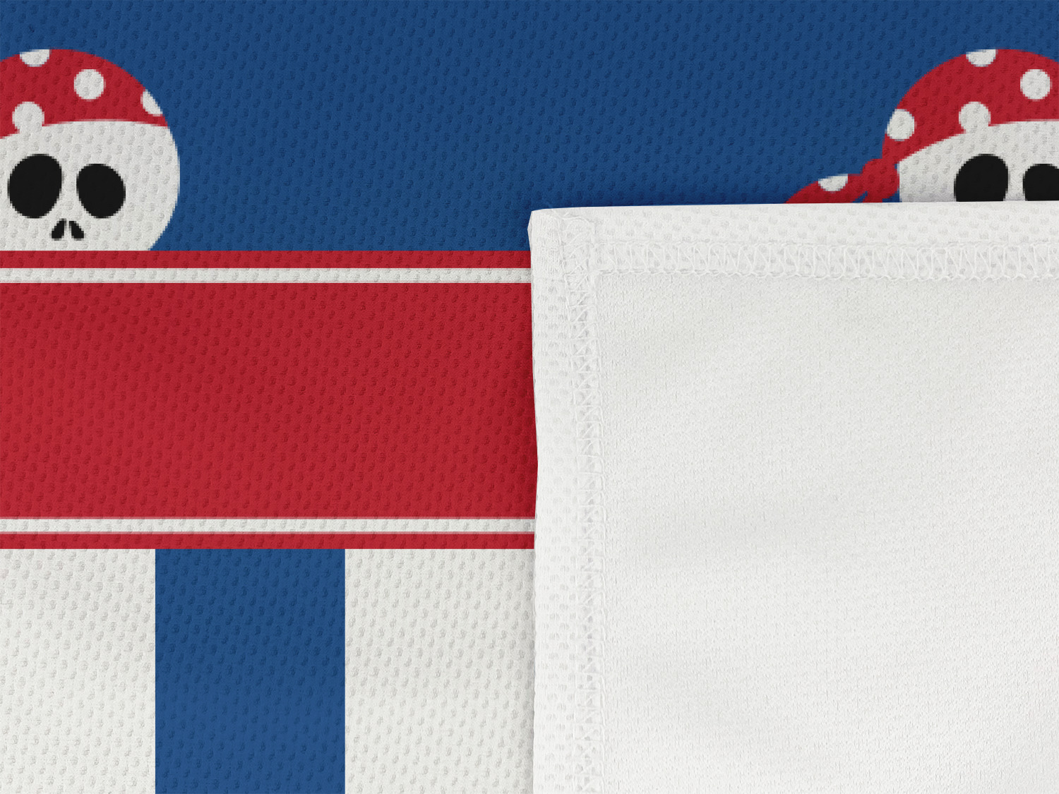 This patriotic pirate brings back the days of Paul Revere. The traditional black and white skull and crossbones are adorned with red and white polka dot dew rags and are highlighted on a backdrop of patriotic blue. The coordinating bottom pattern of patriotic blue and white stripes ties the entire design together.