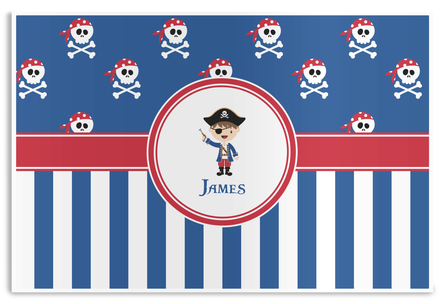 A wide band of red, trimmed in white highlight the pirate boy in the circle label. Add your personalization in the label to complete the look.