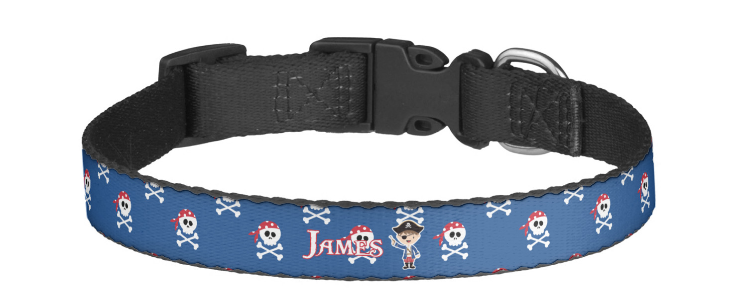 This sturdy collar, made from a durable nylon weave, will outlive your dog's episodes of excited tugging and pulling. Courtesy of its thick plastic buckle and adjuster, this collar is adjustable and accommodating of any dog. Structurally, the collar is a single piece of nylon weave that is sewn together, and features a solid metal loop where you can attach a leash or dog tag. We print and display your dog's name and pattern across the middle of the personalized dog collar.