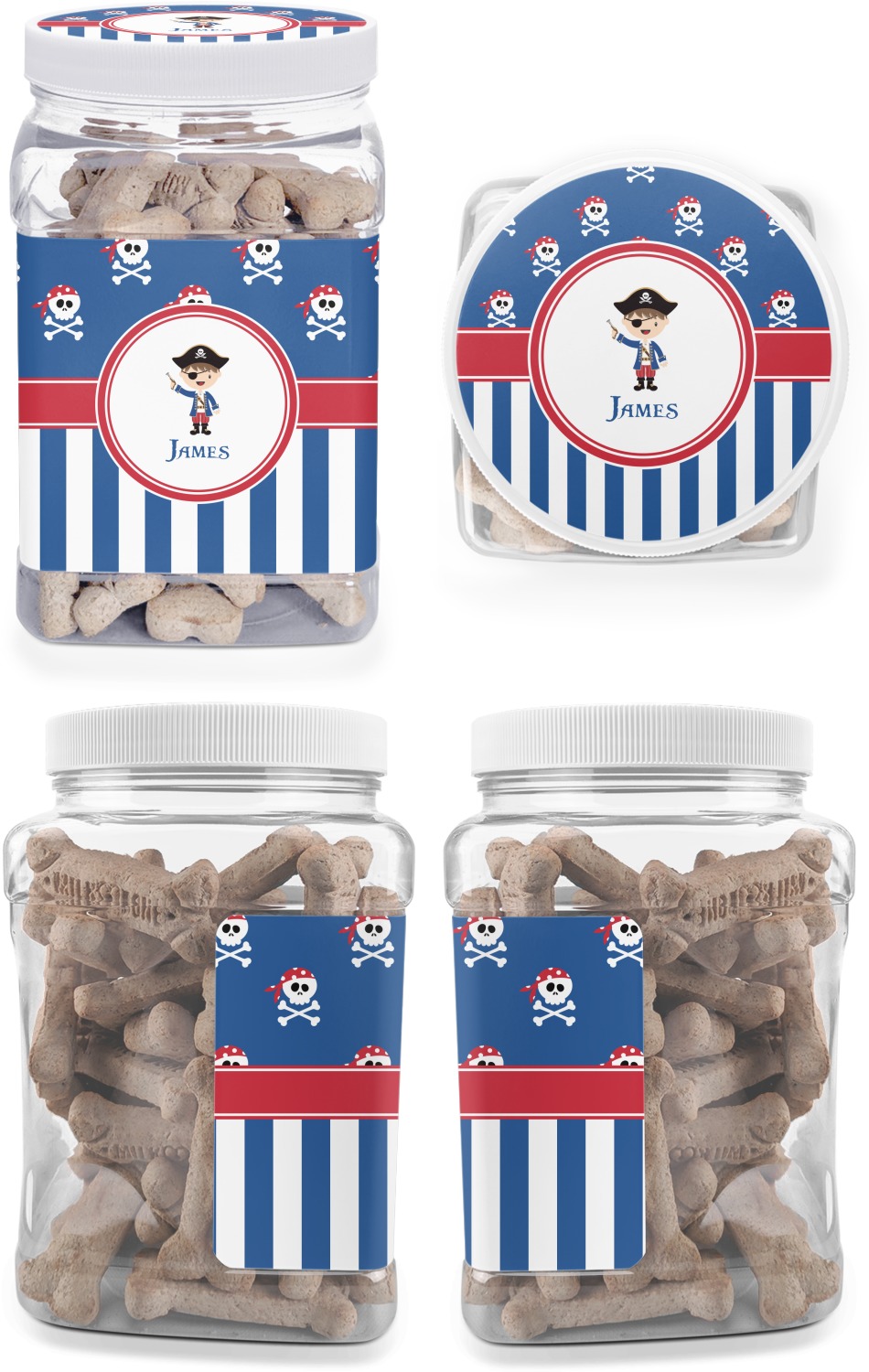 This half gallon jar, made from a sturdy plastic, is the perfect way to keep treats from any naughty pet paws, while still keeping them ready on hand for when your pup performs an impressive trick. This dog cookie jar features a screw-on, white lid that displays your personalized design on a vinyl sticker. We apply another customized sticker that wraps around the front and sides of the jar. Our dog treat jar also has indentations on the rear ends of the sides, which allows for convenient handling, and its square frame allows for easy storage.