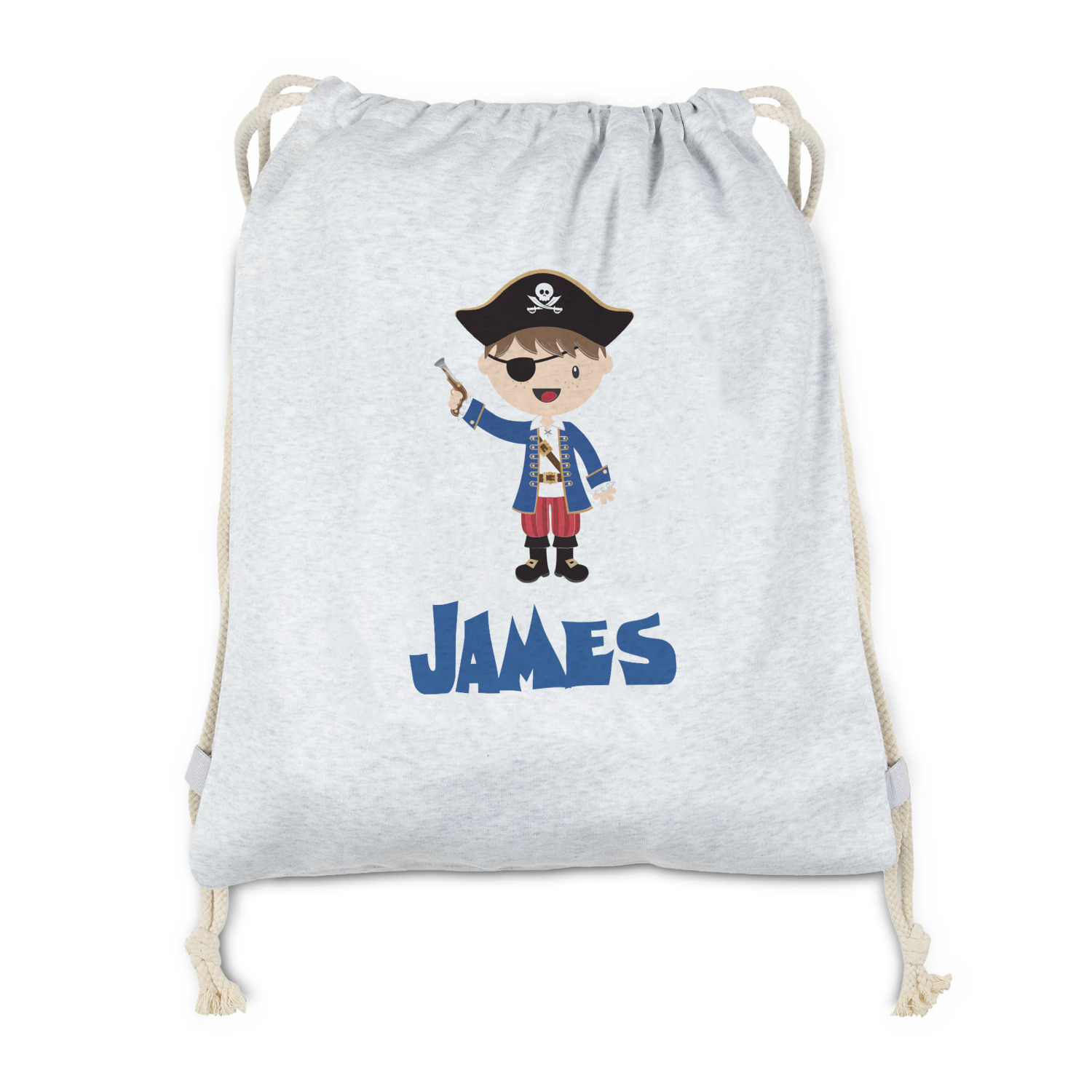 A wide band of red, trimmed in white highlight the pirate boy in the circle label. Add your personalization in the label to complete the look.