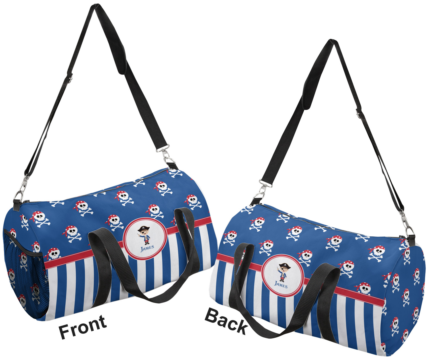 This duffle is a sturdy bag made of a canvas material. It comes in two sizes: Small (19"W x 9.5"H x 9.5"D) and Large (23"W x 12"H x 12"D). The bag is a cylindrical shape with a black adjustable strap and two handles. On one side is an elastic pouch to put a waterbottle or other small item. Your product will be sublimated with your design and is able to be designed on the front, back, and sides. Be sure to remember that the straps may cut into parts of your design if you upload your own artwork.
