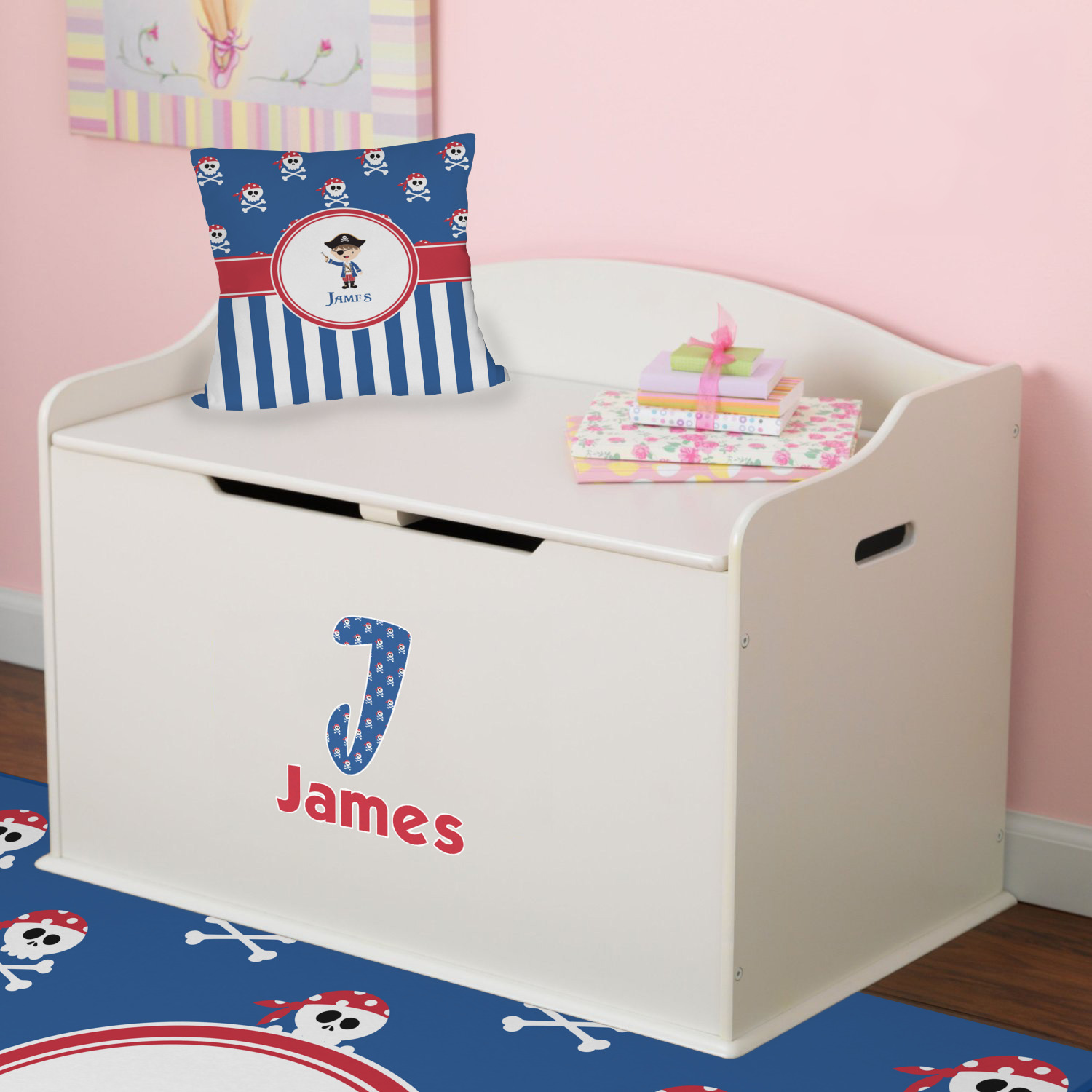 A wide band of red, trimmed in white highlight the pirate boy in the circle label. Add your personalization in the label to complete the look.