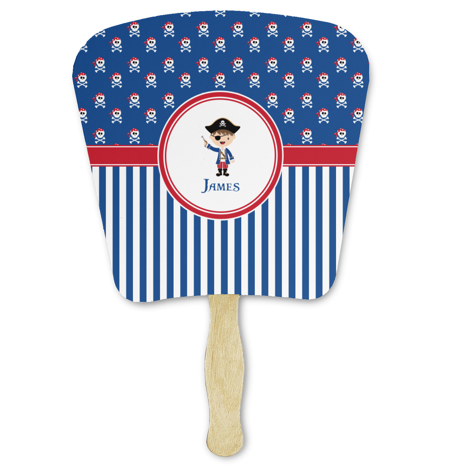 A wide band of red, trimmed in white highlight the pirate boy in the circle label. Add your personalization in the label to complete the look.