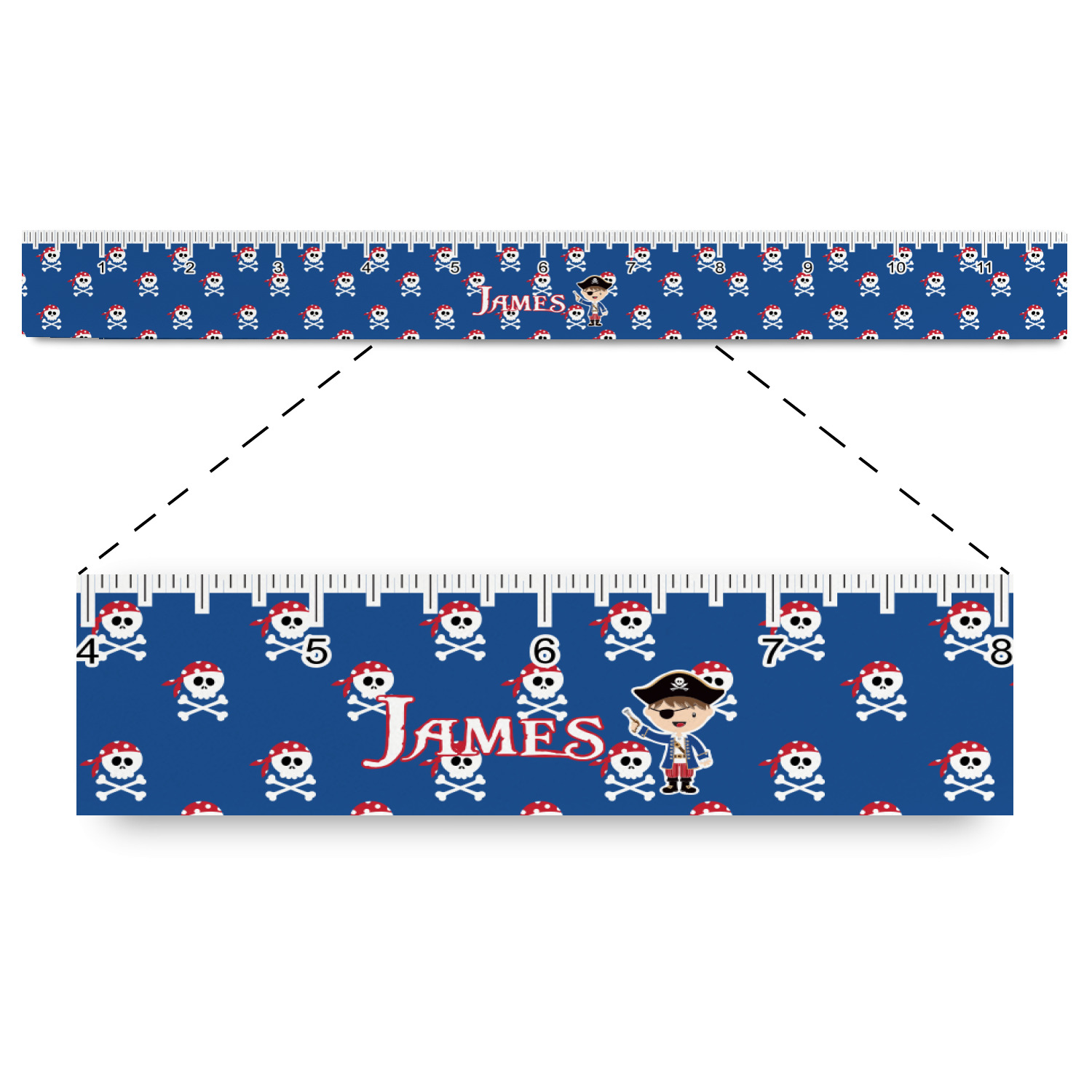A wide band of red, trimmed in white highlight the pirate boy in the circle label. Add your personalization in the label to complete the look.