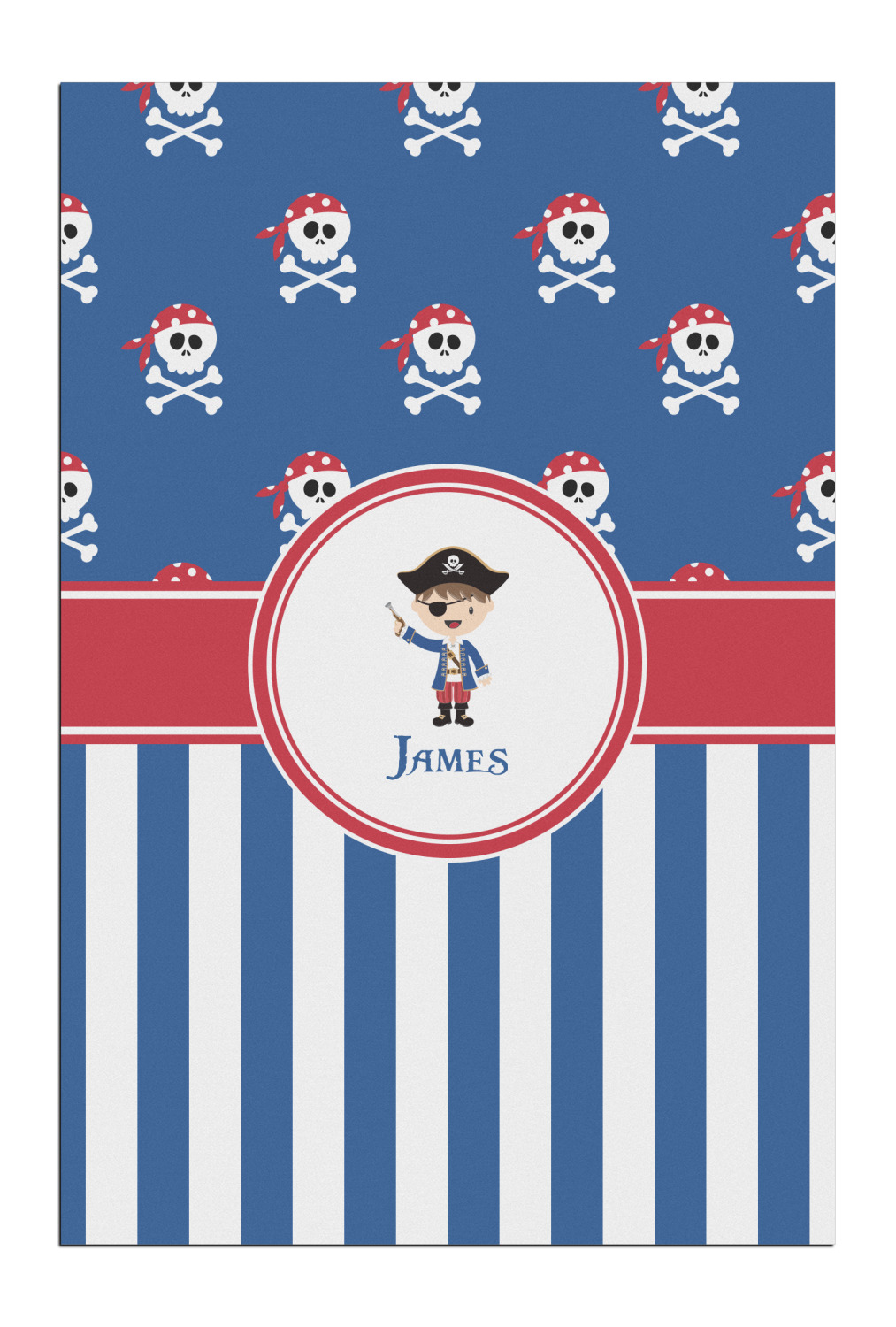 A wide band of red, trimmed in white highlight the pirate boy in the circle label. Add your personalization in the label to complete the look.
