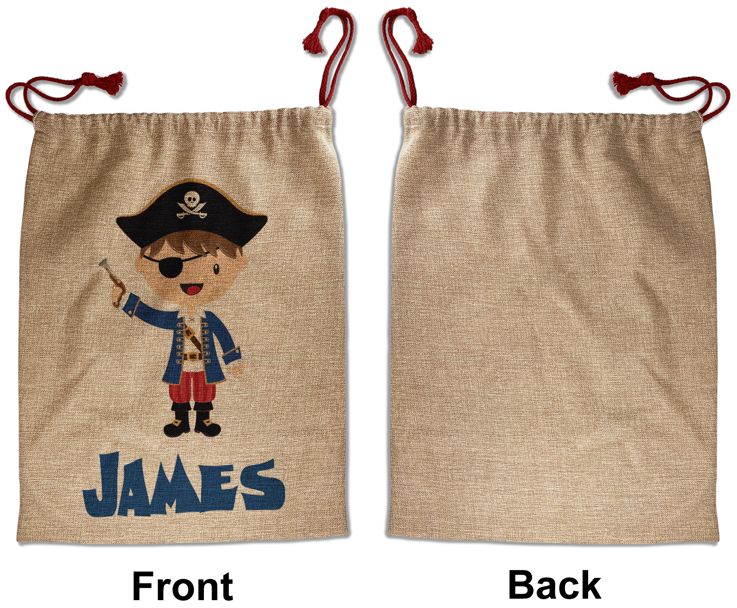 A wide band of red, trimmed in white highlight the pirate boy in the circle label. Add your personalization in the label to complete the look.