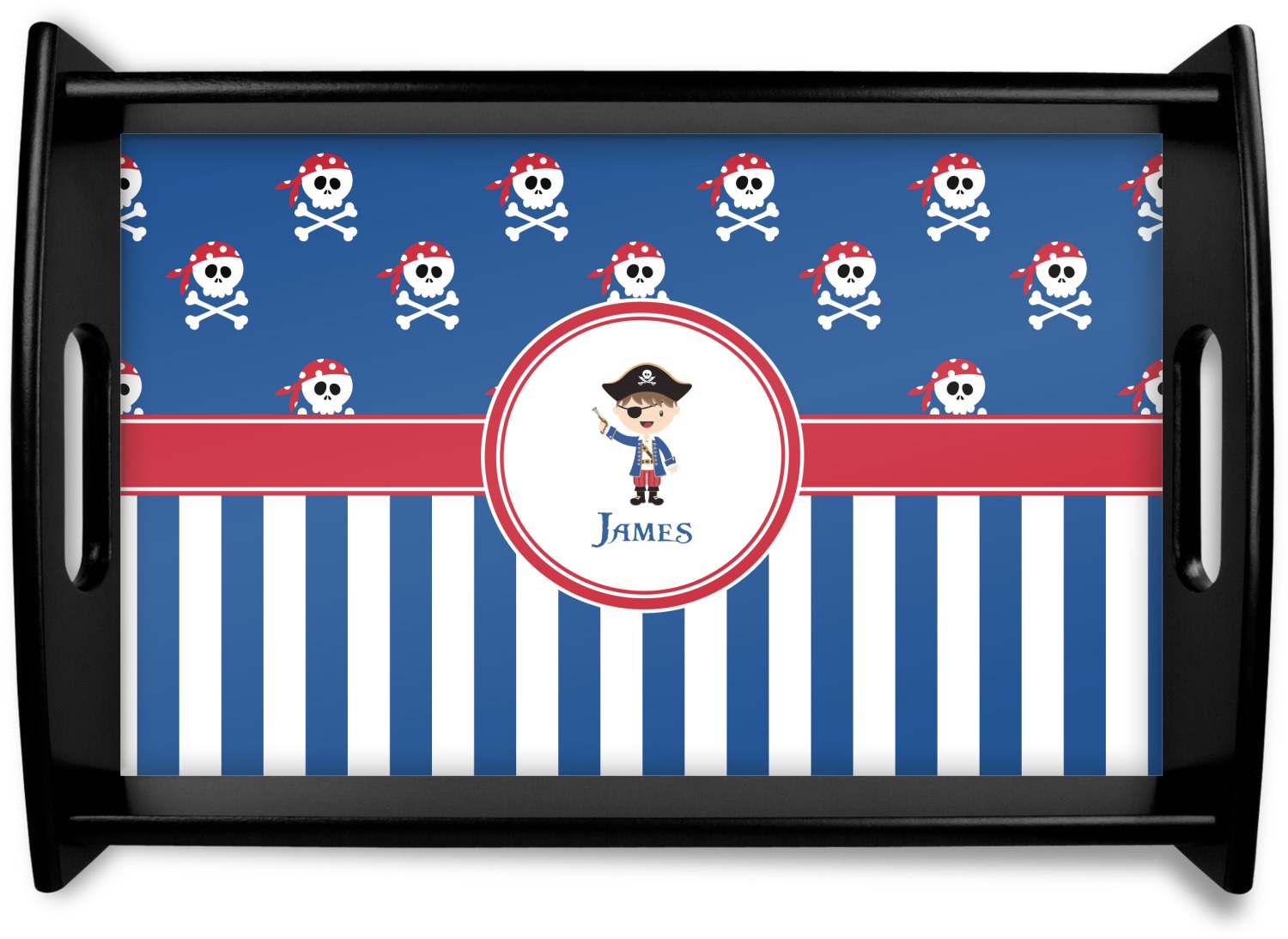 A wide band of red, trimmed in white highlight the pirate boy in the circle label. Add your personalization in the label to complete the look.
