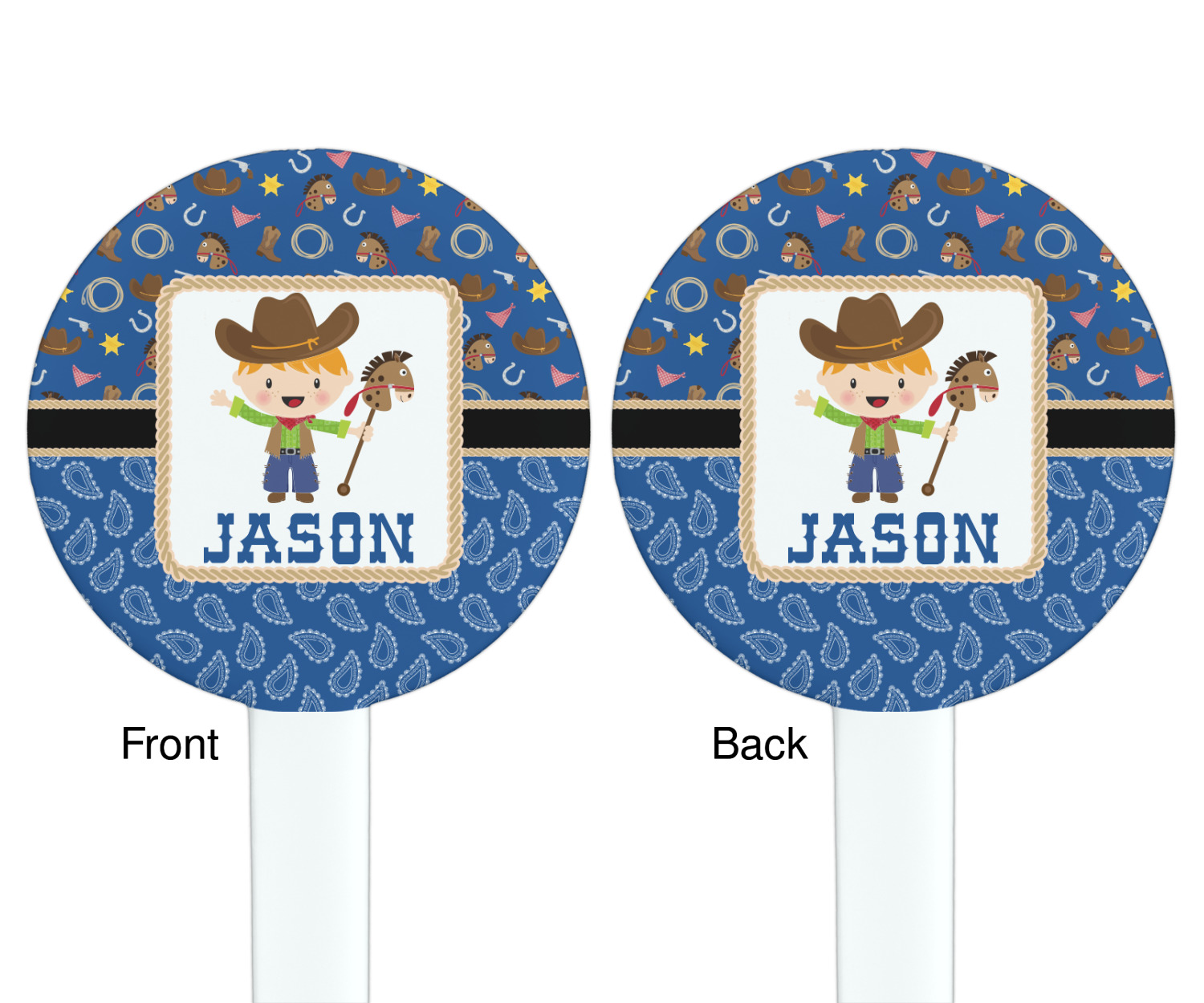 A square label showcasing our cute little cowboy holding his lasso has your little one dreaming of being a cowboy on the range one day.