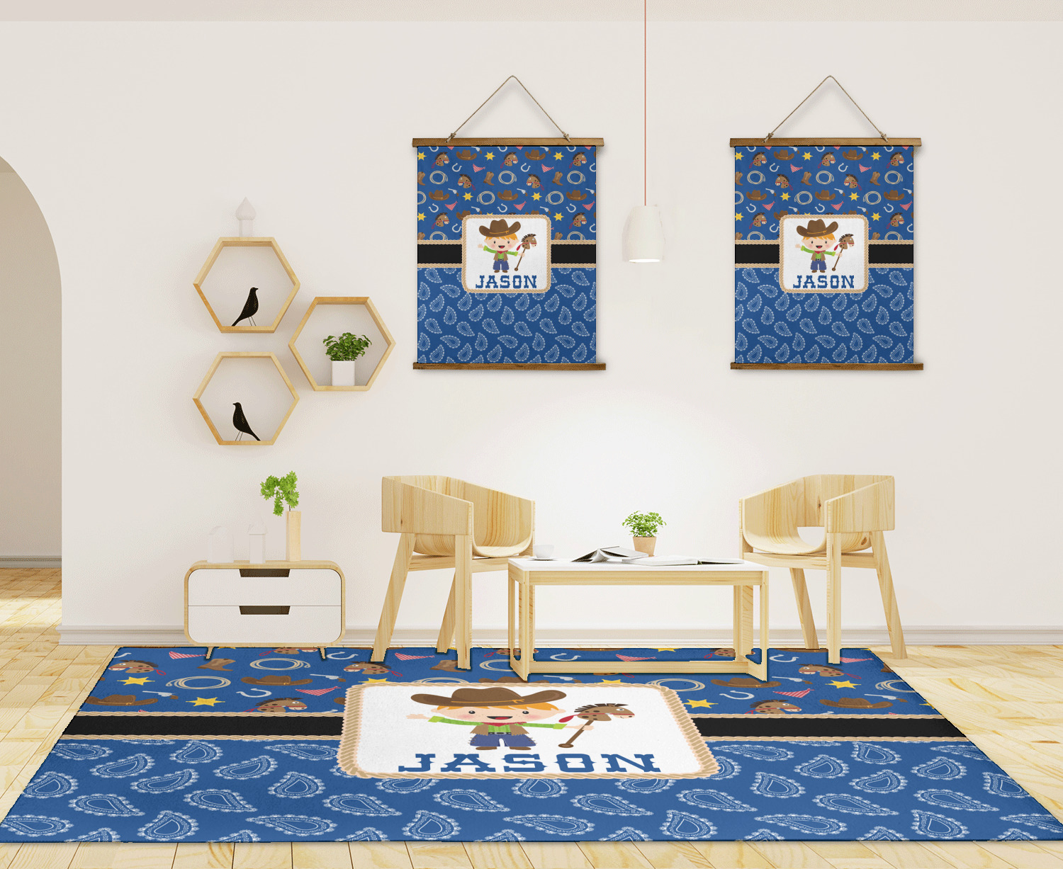 Howdy Y'all! What little country boy wouldn't want to be surrounded by this cute Western theme design? Set on a backdrop of blue, the horses, cowboy boots and hats, rope, guns, Sheriff badges, and bandannas set the scene for a hoedown every day. A coordinating blue paisley pattern on the bottom tie the entire design together. A wide band of red trimmed in rope add that special touch of design.