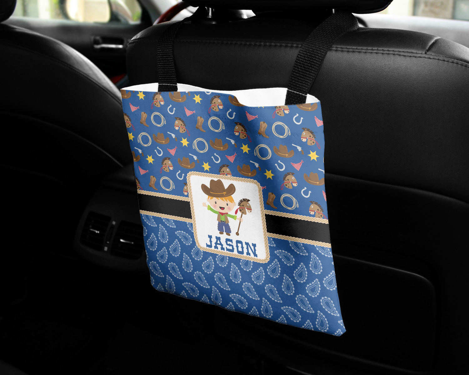 These car back seat organizers are sturdy tote-like bags, fabricated from a robust polyester, and features a single handle on the back side. The strap features an attachable velcro for easy attachment to headrests, grocery carts, car seats, and more. Simply undo the velcro, loop the strap around the headrest, reattach the velcro, and let the organizer hang from the front seat. These car organizers are the perfect means of increasing your backseat's legroom, while storing multiple items in one place for better accessibility. Each car back seat organizer measures at 10 by 10 inches, and features your personalized design printed across its front and back.