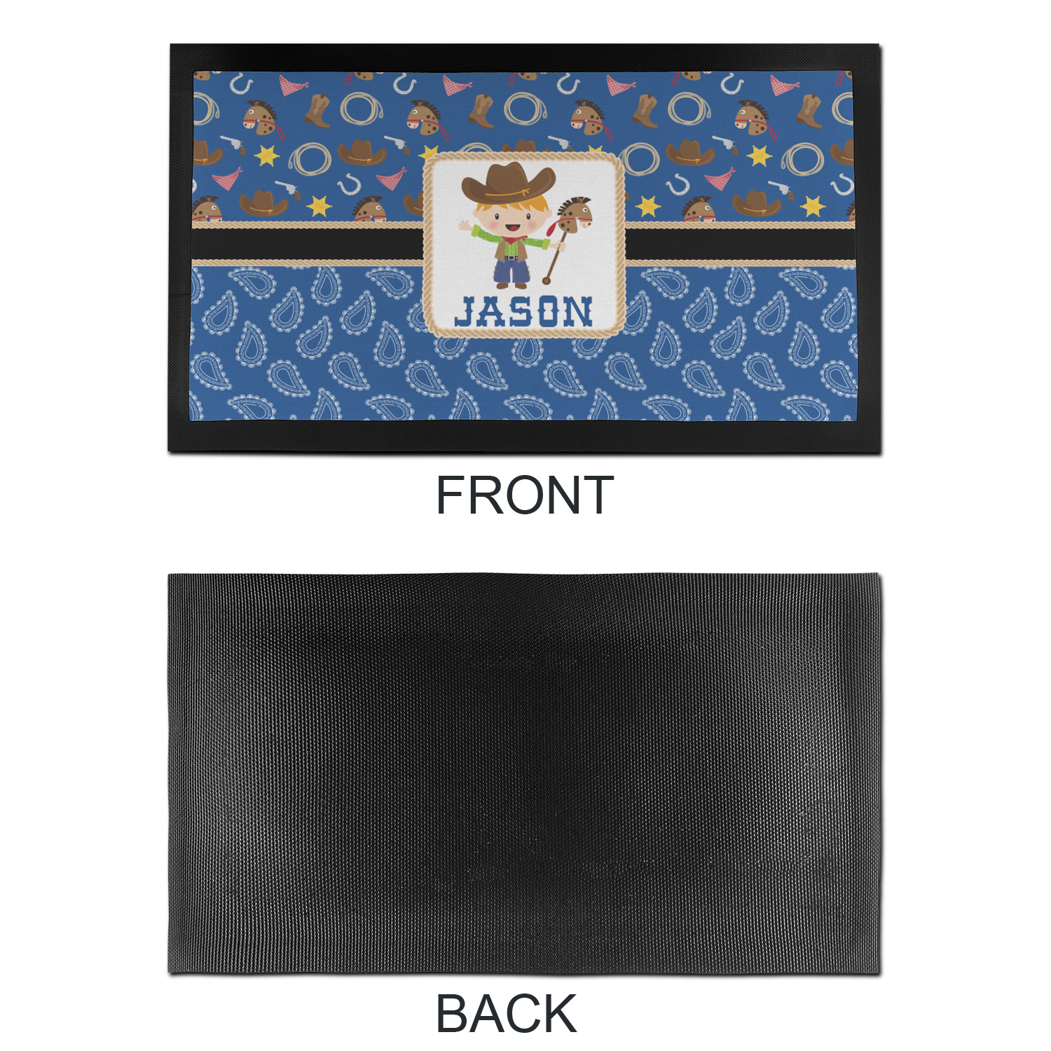 A square label showcasing our cute little cowboy holding his lasso has your little one dreaming of being a cowboy on the range one day.