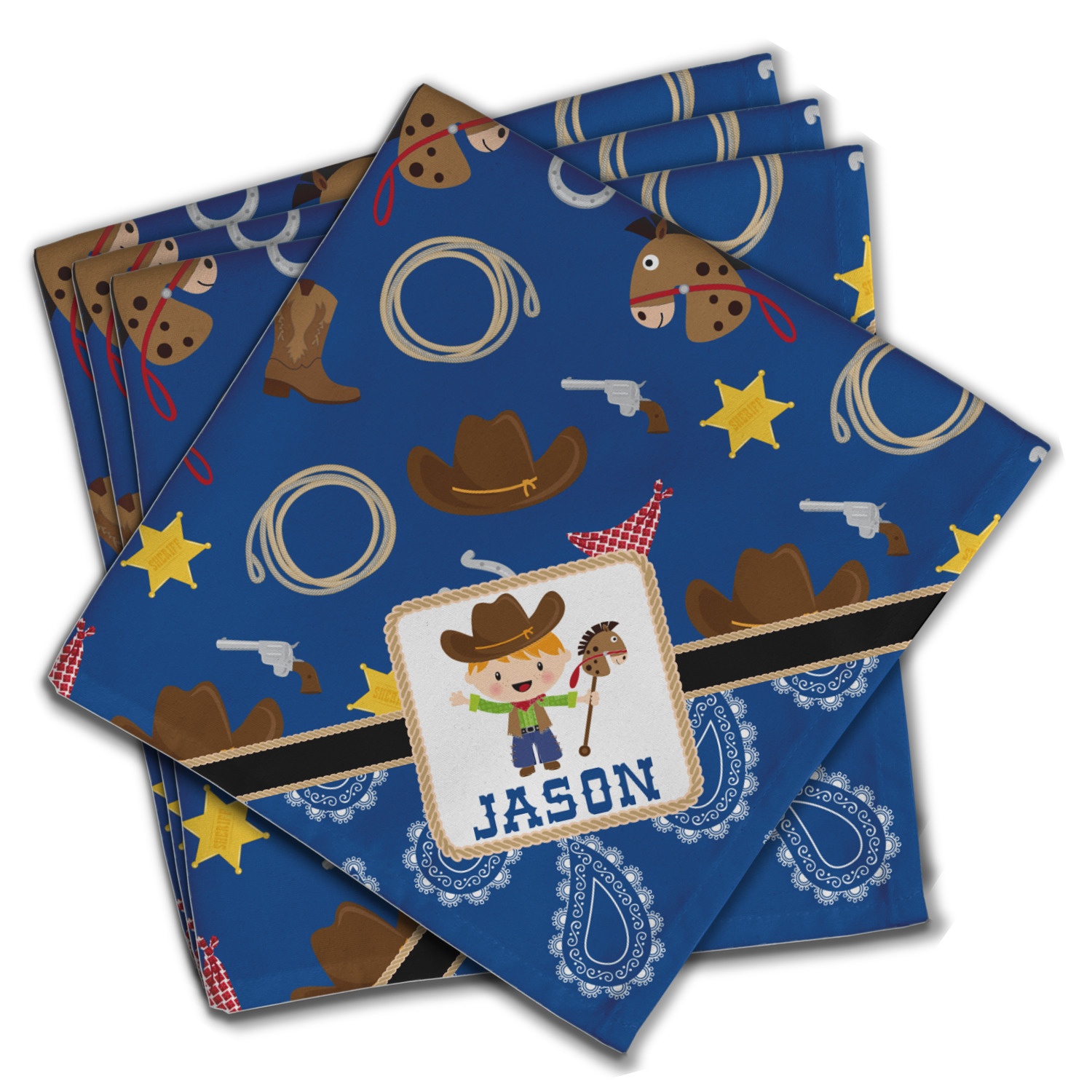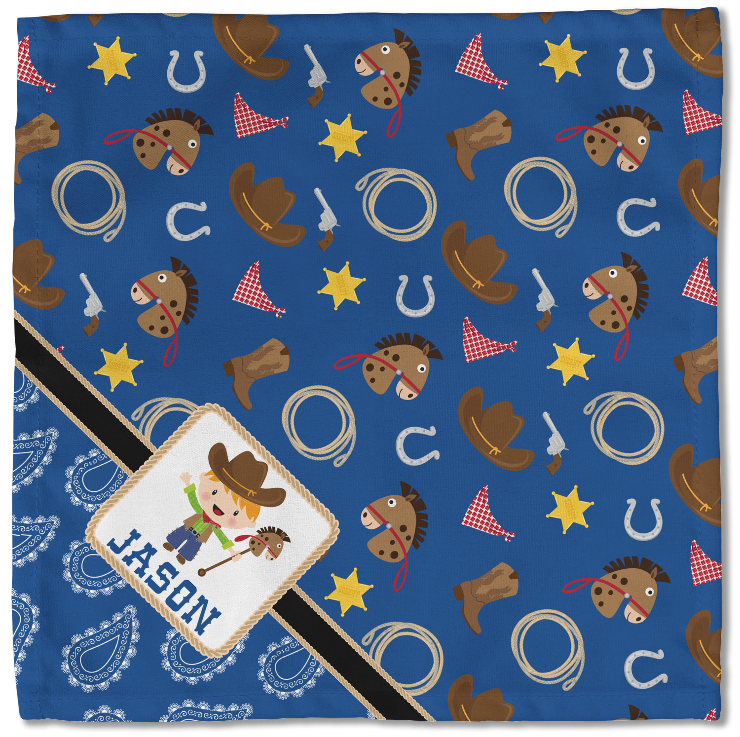 A square label showcasing our cute little cowboy holding his lasso has your little one dreaming of being a cowboy on the range one day.