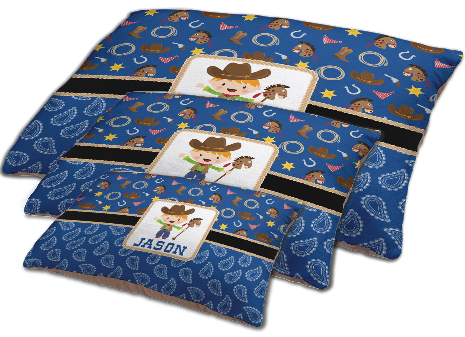 Howdy Y'all! What little country boy wouldn't want to be surrounded by this cute Western theme design? Set on a backdrop of blue, the horses, cowboy boots and hats, rope, guns, Sheriff badges, and bandannas set the scene for a hoedown every day. A coordinating blue paisley pattern on the bottom tie the entire design together. A wide band of red trimmed in rope add that special touch of design.