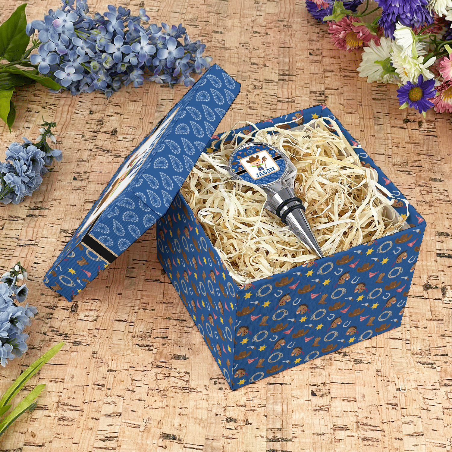 A square label showcasing our cute little cowboy holding his lasso has your little one dreaming of being a cowboy on the range one day.