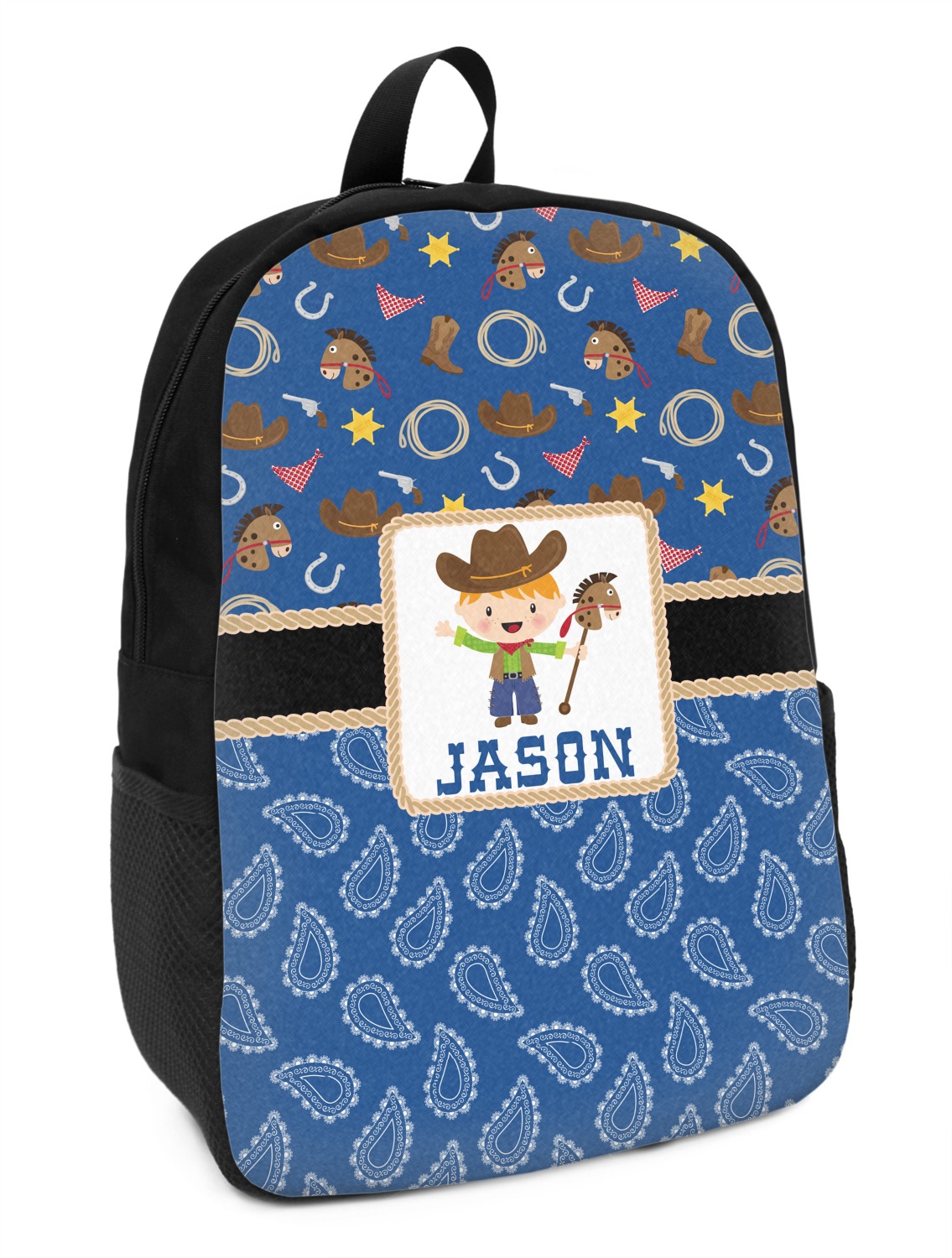 These small backpacks are made of a durable black canvas material with your personalization right on the front. The two shoulder straps are padded and easily adjustable. The bag itself measures at about 11" W x 15" H x 5" D. It's the perfect size for elementary aged kids or adults who want a smaller backpack. On the top of the bag you will find a handle to hang or carry your backpack by as well as a large zipper closure to keep all of your belongings safe inside. On each side of your backpack is a mesh pocket for a small item or water bottle. Inside your backpack you will find a spacious area with a small zipper pocket and a padded laptop slot that will fit up to a 13" laptop (13" being very snug). This is the perfect bag for any student that needs a couple books and their laptop with them at all times. It also works great as a carry on for traveling!