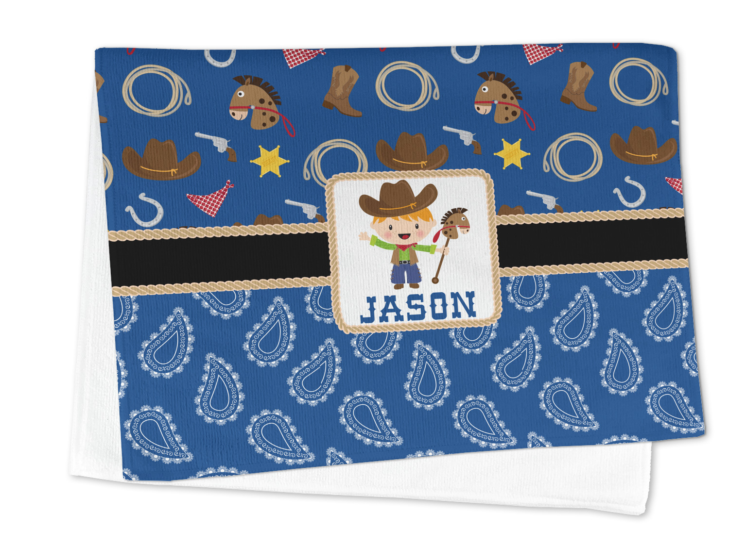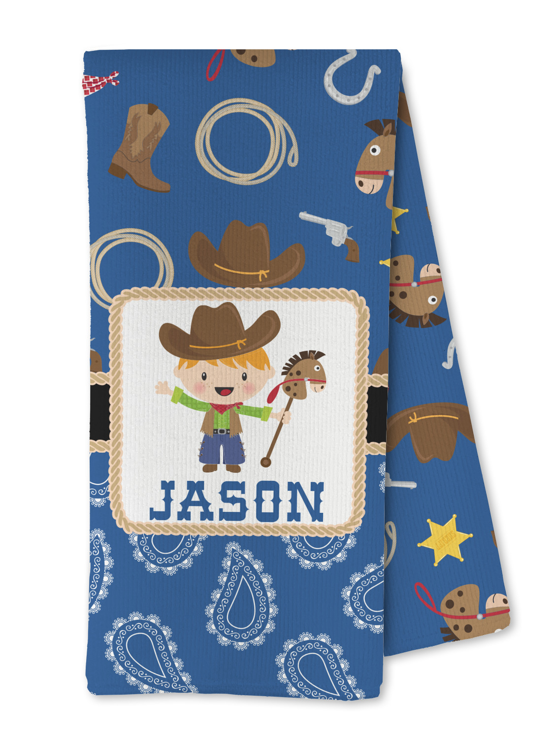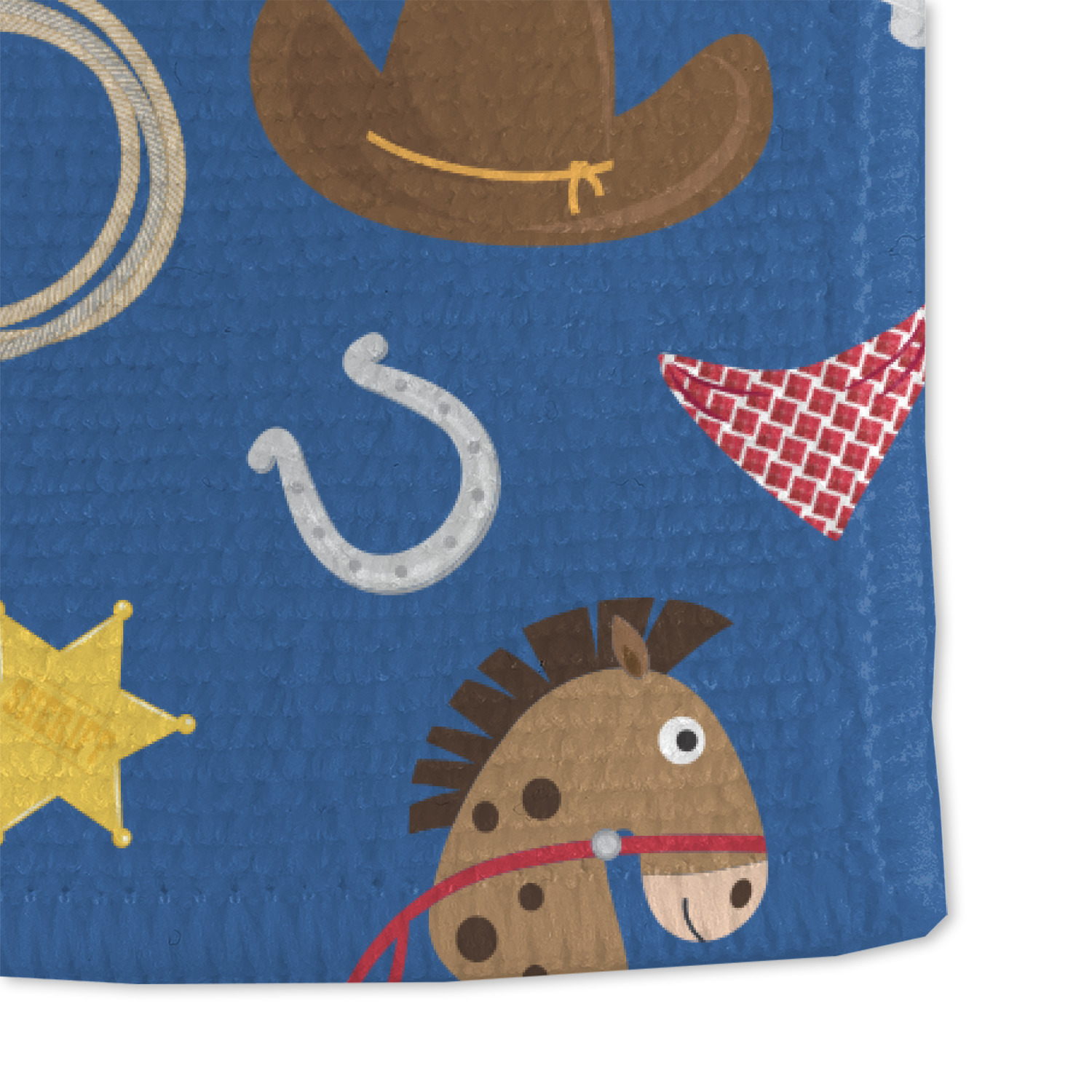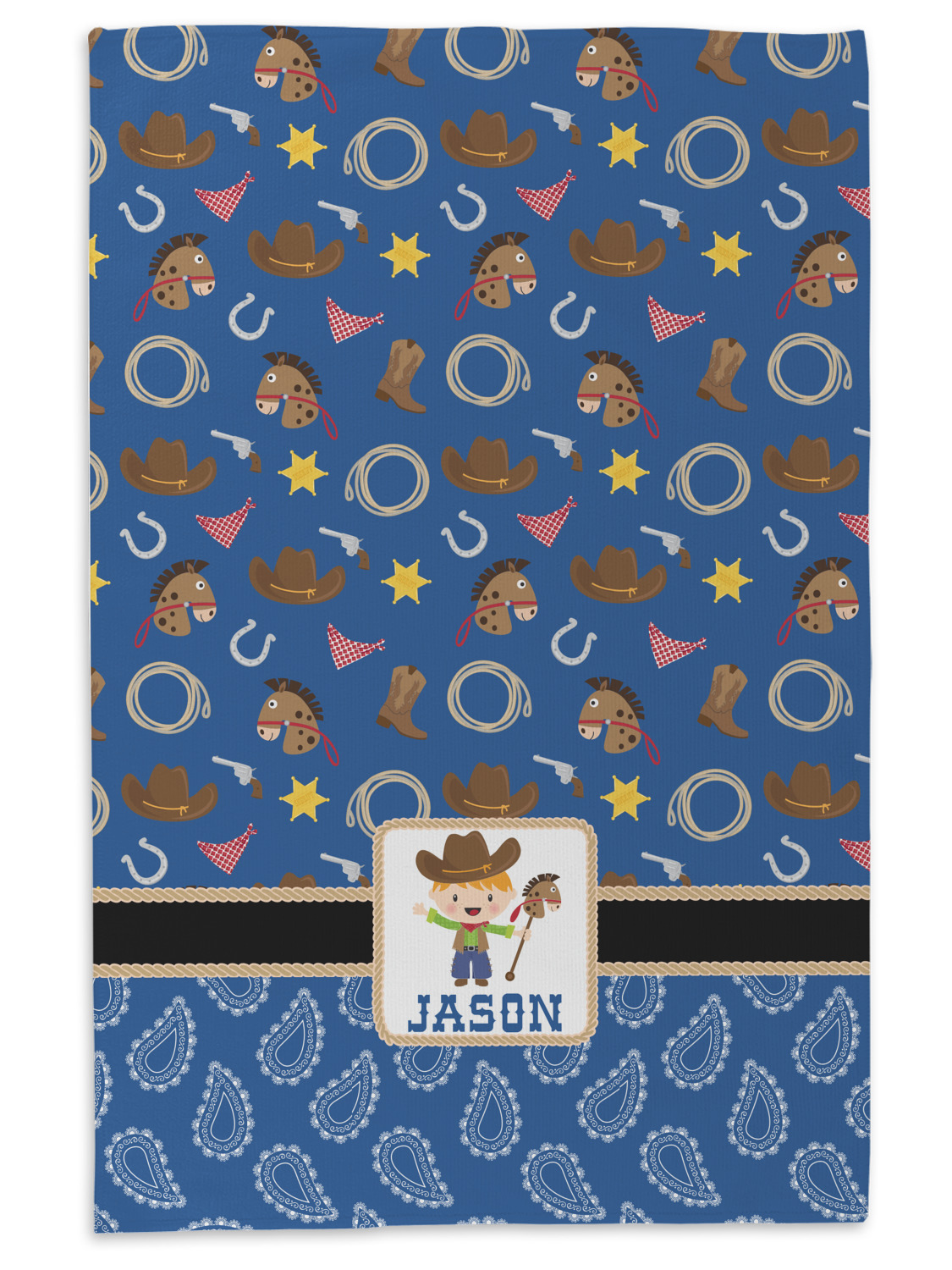 Howdy Y'all! What little country boy wouldn't want to be surrounded by this cute Western theme design? Set on a backdrop of blue, the horses, cowboy boots and hats, rope, guns, Sheriff badges, and bandannas set the scene for a hoedown every day. A coordinating blue paisley pattern on the bottom tie the entire design together. A wide band of red trimmed in rope add that special touch of design.