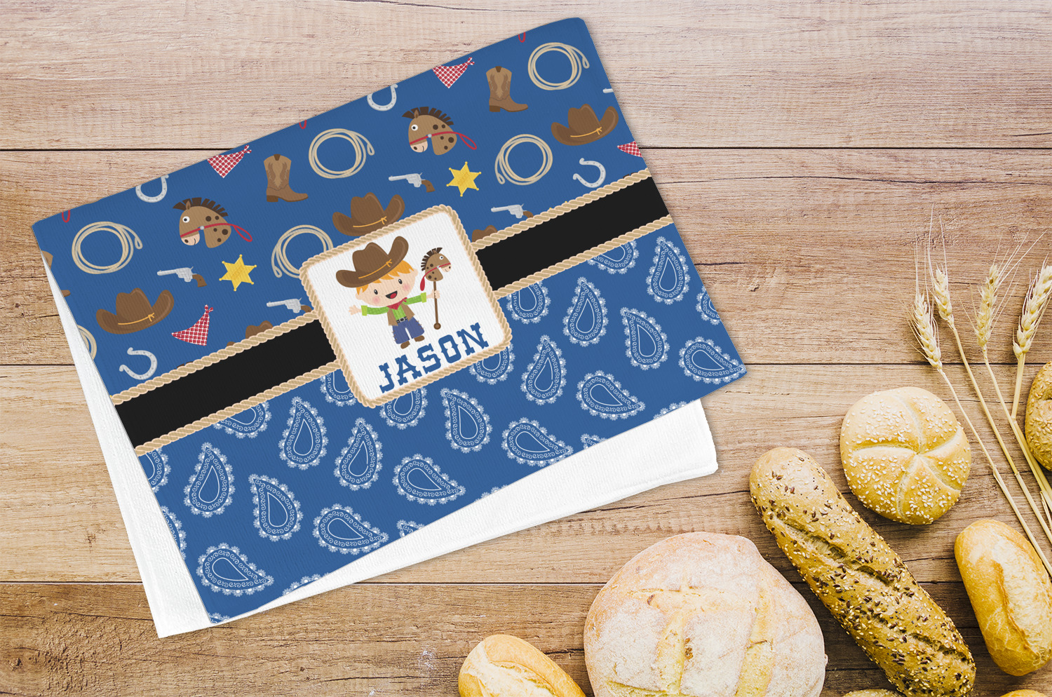 A square label showcasing our cute little cowboy holding his lasso has your little one dreaming of being a cowboy on the range one day.