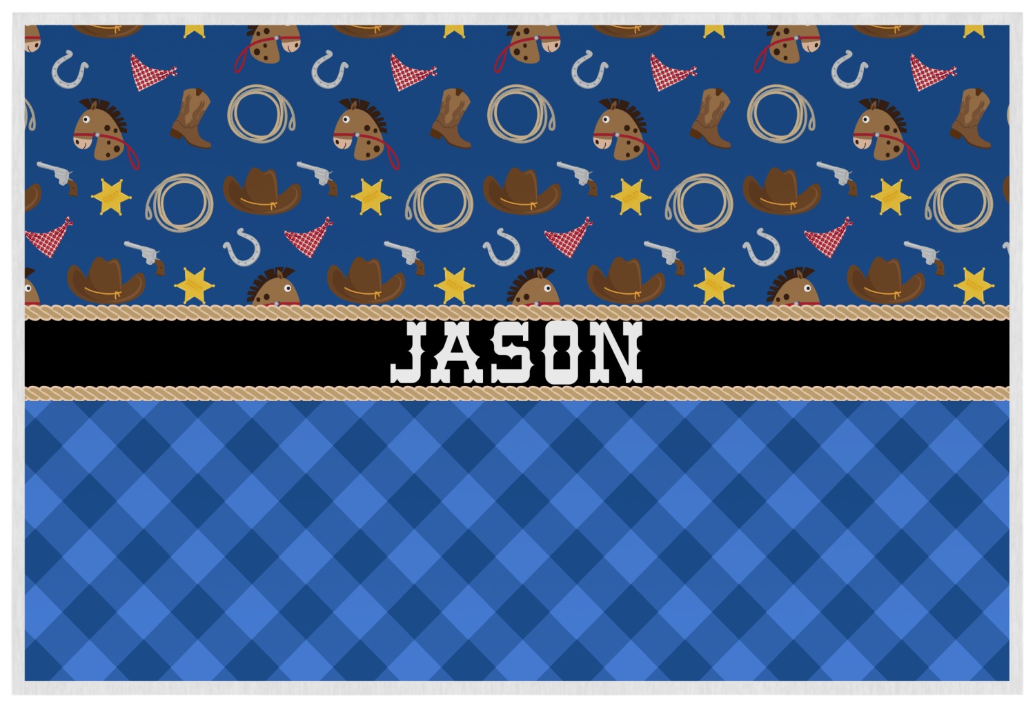 Howdy Y'all! What little country boy wouldn't want to be surrounded by this cute Western theme design? Set on a backdrop of blue, the horses, cowboy boots and hats, rope, guns, Sheriff badges, and bandannas set the scene for a hoedown every day. A coordinating blue paisley pattern on the bottom tie the entire design together. A wide band of red trimmed in rope add that special touch of design.