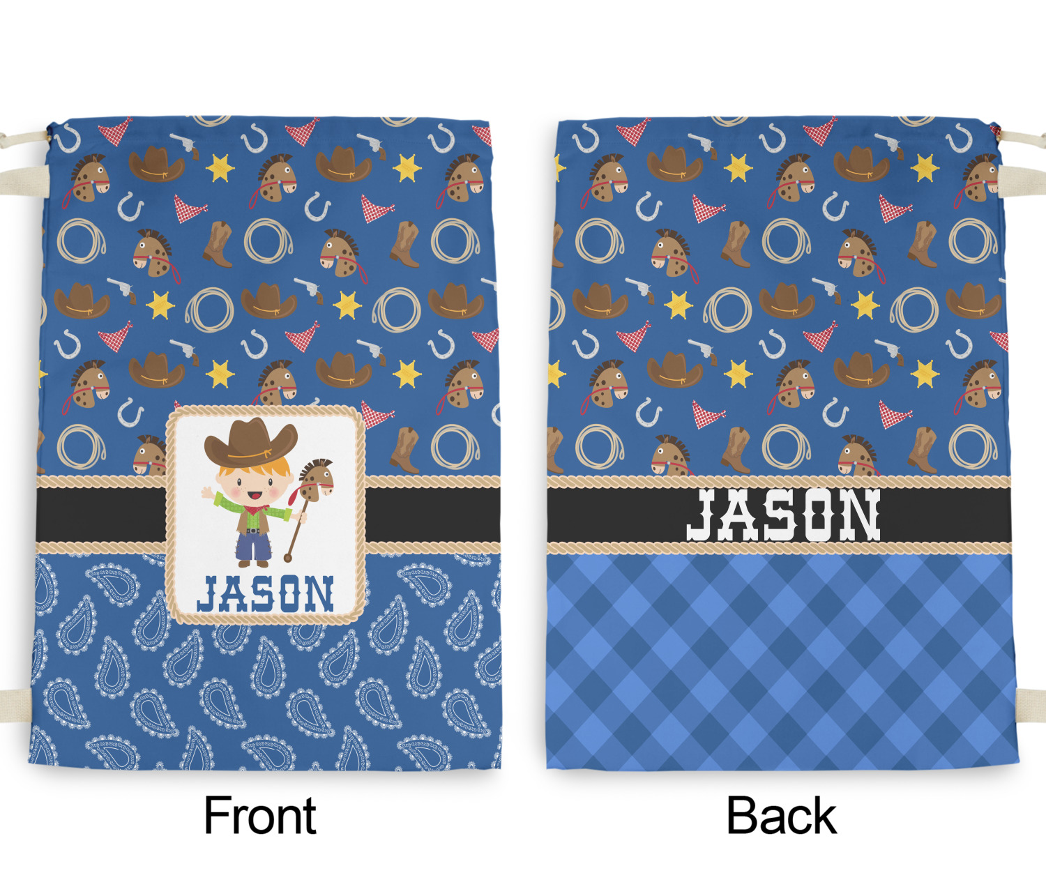 Carry your laundry in style with these customized laundry bags. Available in two sizes, featuring a natural colored woven strap and a cinch cord, these bags hold a lot of clothes or anything else you want to fit in them.