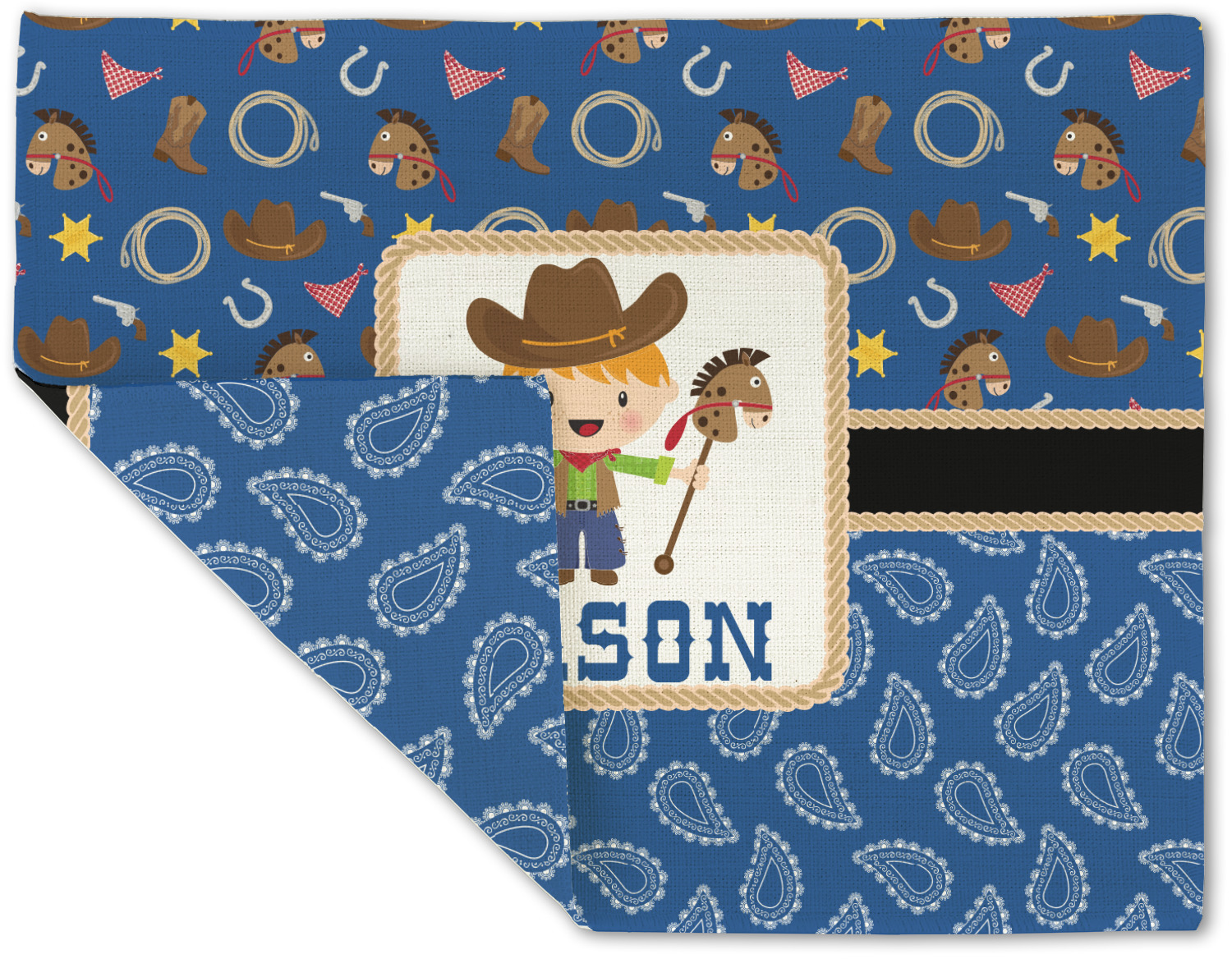 Howdy Y'all! What little country boy wouldn't want to be surrounded by this cute Western theme design? Set on a backdrop of blue, the horses, cowboy boots and hats, rope, guns, Sheriff badges, and bandannas set the scene for a hoedown every day. A coordinating blue paisley pattern on the bottom tie the entire design together. A wide band of red trimmed in rope add that special touch of design.