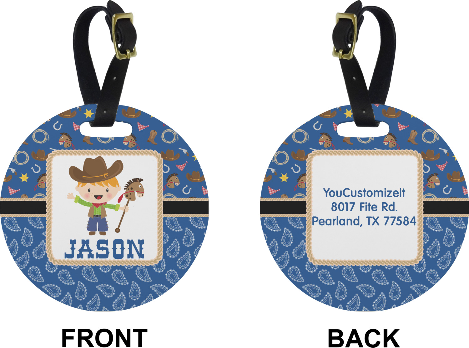 These personalized bag tags are sold in a variety of shapes, so that you may find the product that meets your vision exactly. We sell a round luggage tag, which measures at approximately 4" x 4". Our square luggage tag is about 3.5" x 3.5", while our rectangular version is 2.75" x 4 ".