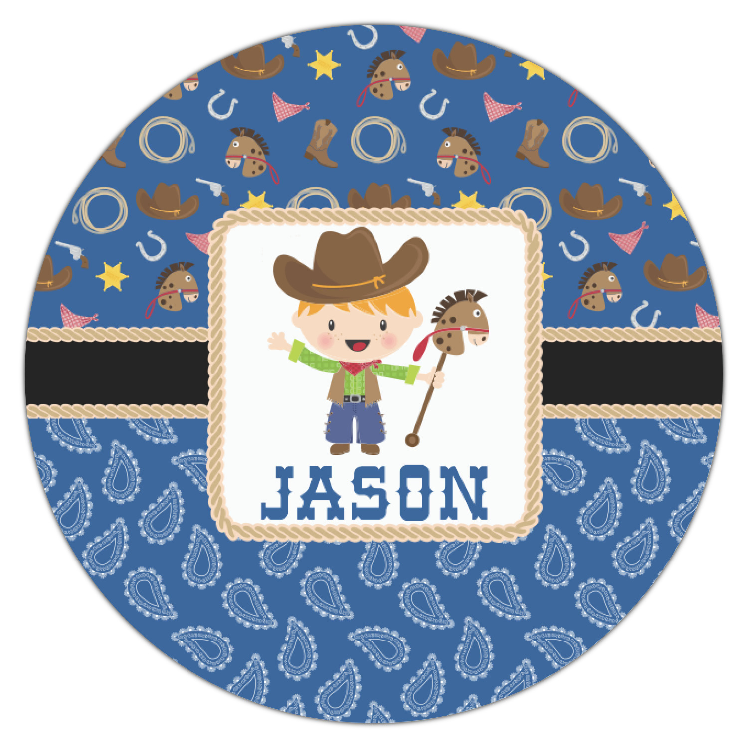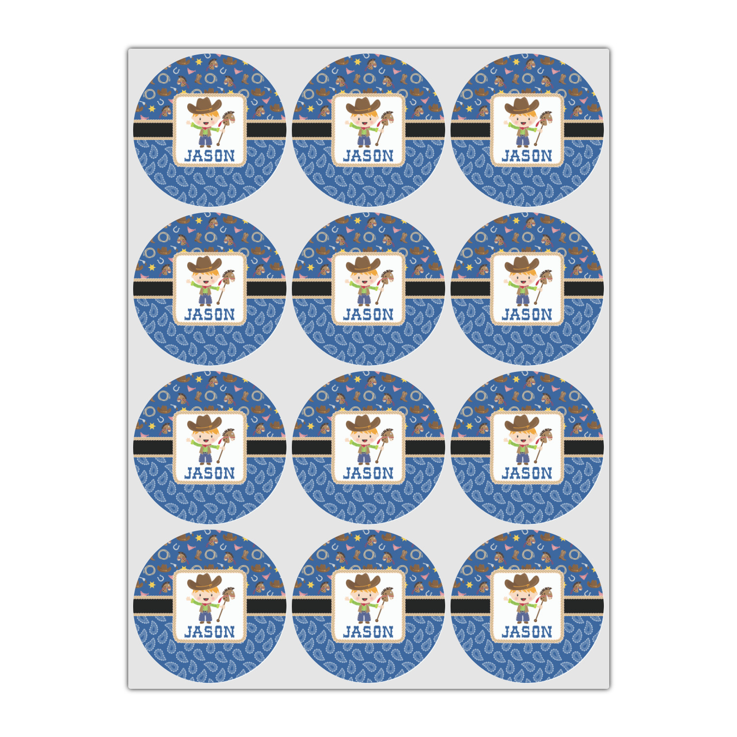 A square label showcasing our cute little cowboy holding his lasso has your little one dreaming of being a cowboy on the range one day.