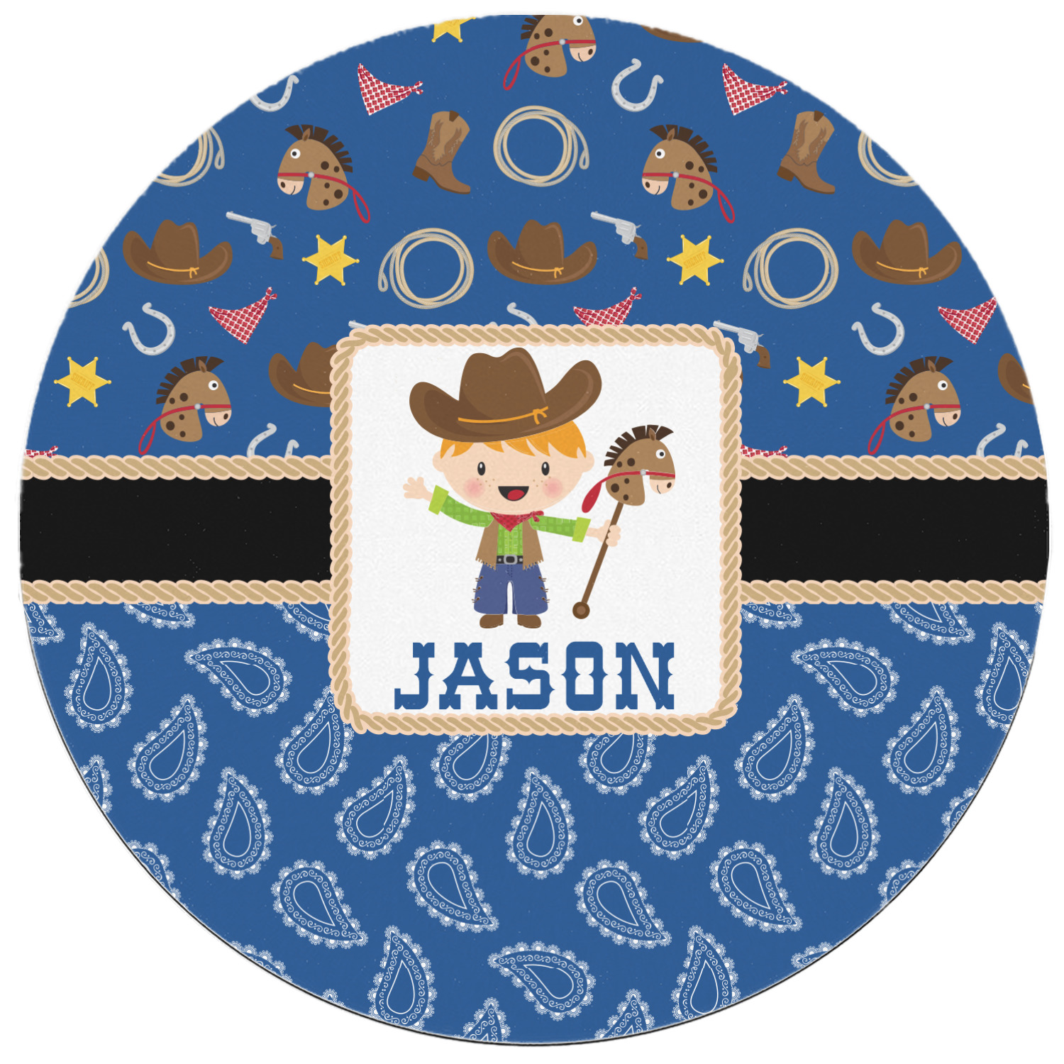 A square label showcasing our cute little cowboy holding his lasso has your little one dreaming of being a cowboy on the range one day.