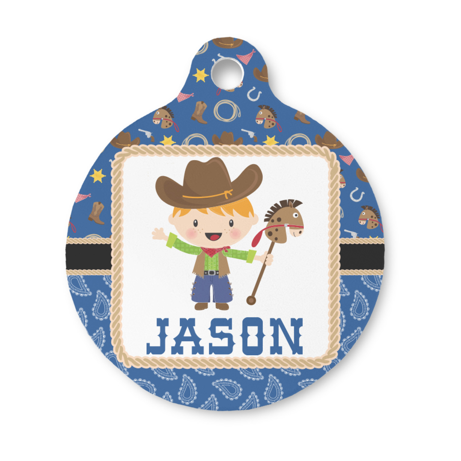 A square label showcasing our cute little cowboy holding his lasso has your little one dreaming of being a cowboy on the range one day.