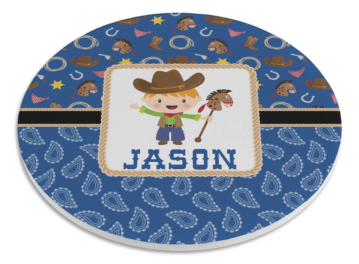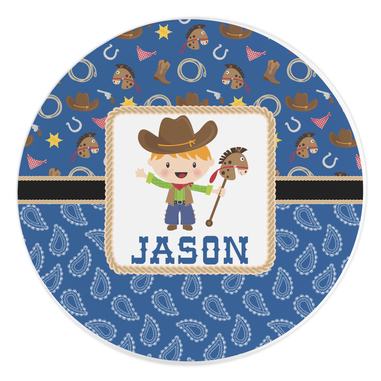 A square label showcasing our cute little cowboy holding his lasso has your little one dreaming of being a cowboy on the range one day.