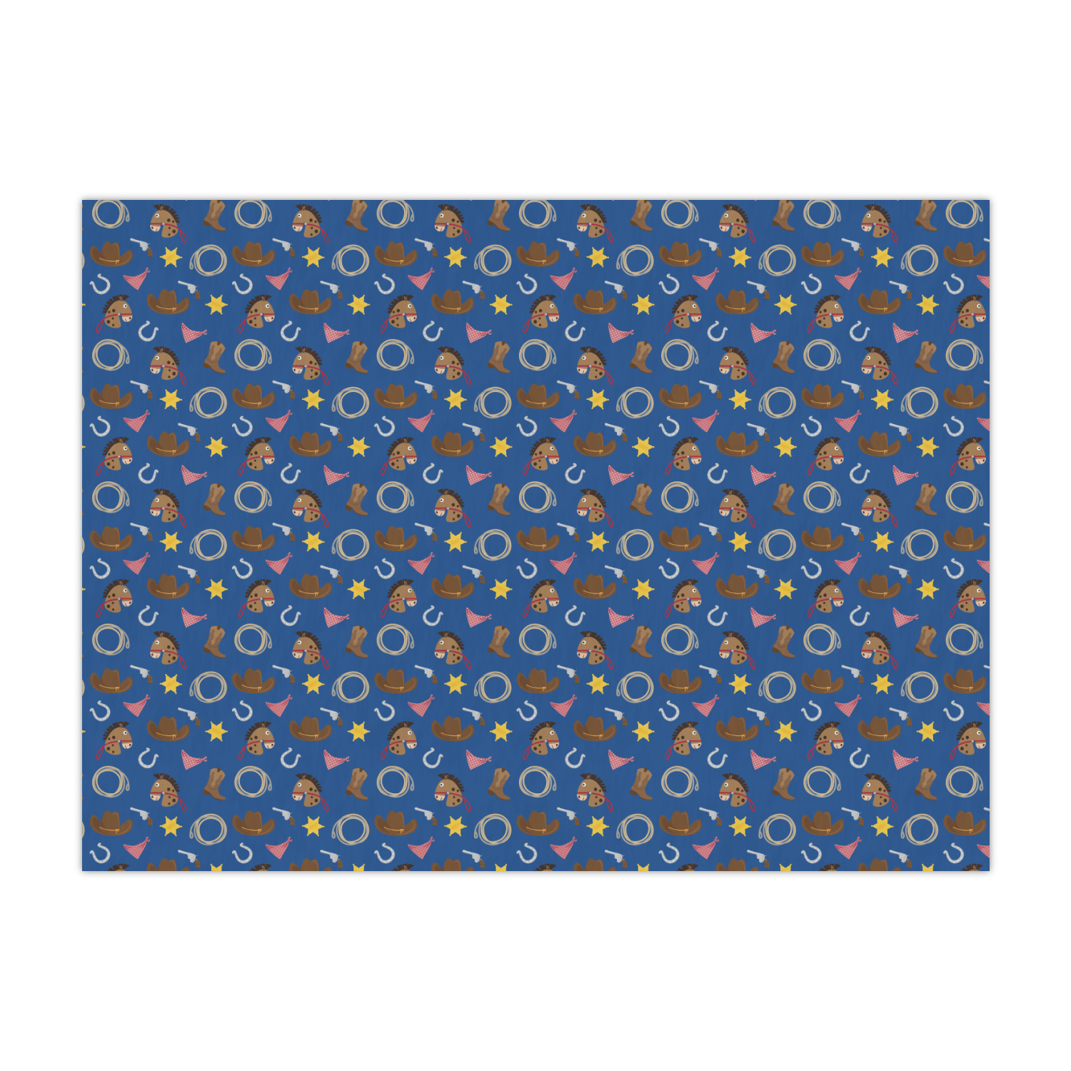 Howdy Y'all! What little country boy wouldn't want to be surrounded by this cute Western theme design? Set on a backdrop of blue, the horses, cowboy boots and hats, rope, guns, Sheriff badges, and bandannas set the scene for a hoedown every day. A coordinating blue paisley pattern on the bottom tie the entire design together. A wide band of red trimmed in rope add that special touch of design.