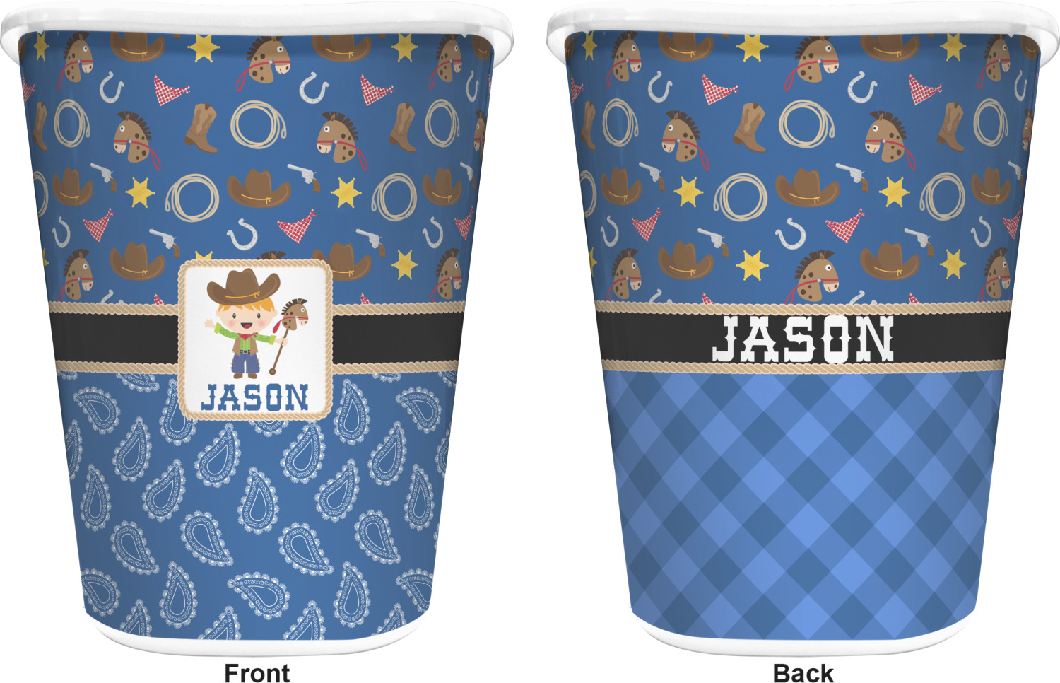 You can choose to purchase these decorative wastebaskets in either a white or a black color that will show on the base and the upper rim. Your customization is printed on a high-gloss, fine-quality vinyl adhesive, and you can choose to either have this adhesive applied to one side only or to both sides. As such, this plastic wastebasket can be single-sided or double-sided, depending on your creative vision. Your customization is printed using durable inks, making the design waterproof and resistant to fading over time.