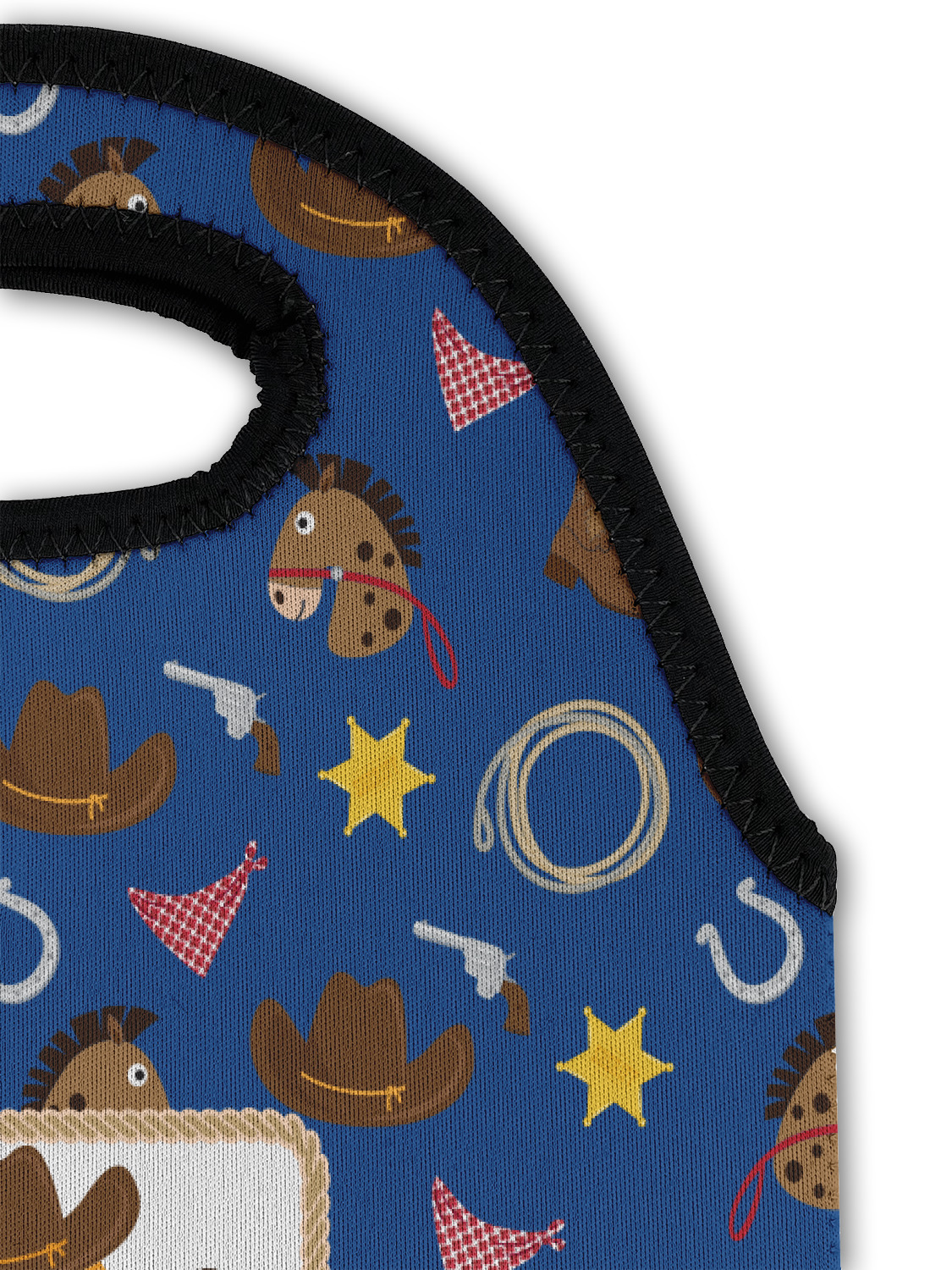 A square label showcasing our cute little cowboy holding his lasso has your little one dreaming of being a cowboy on the range one day.