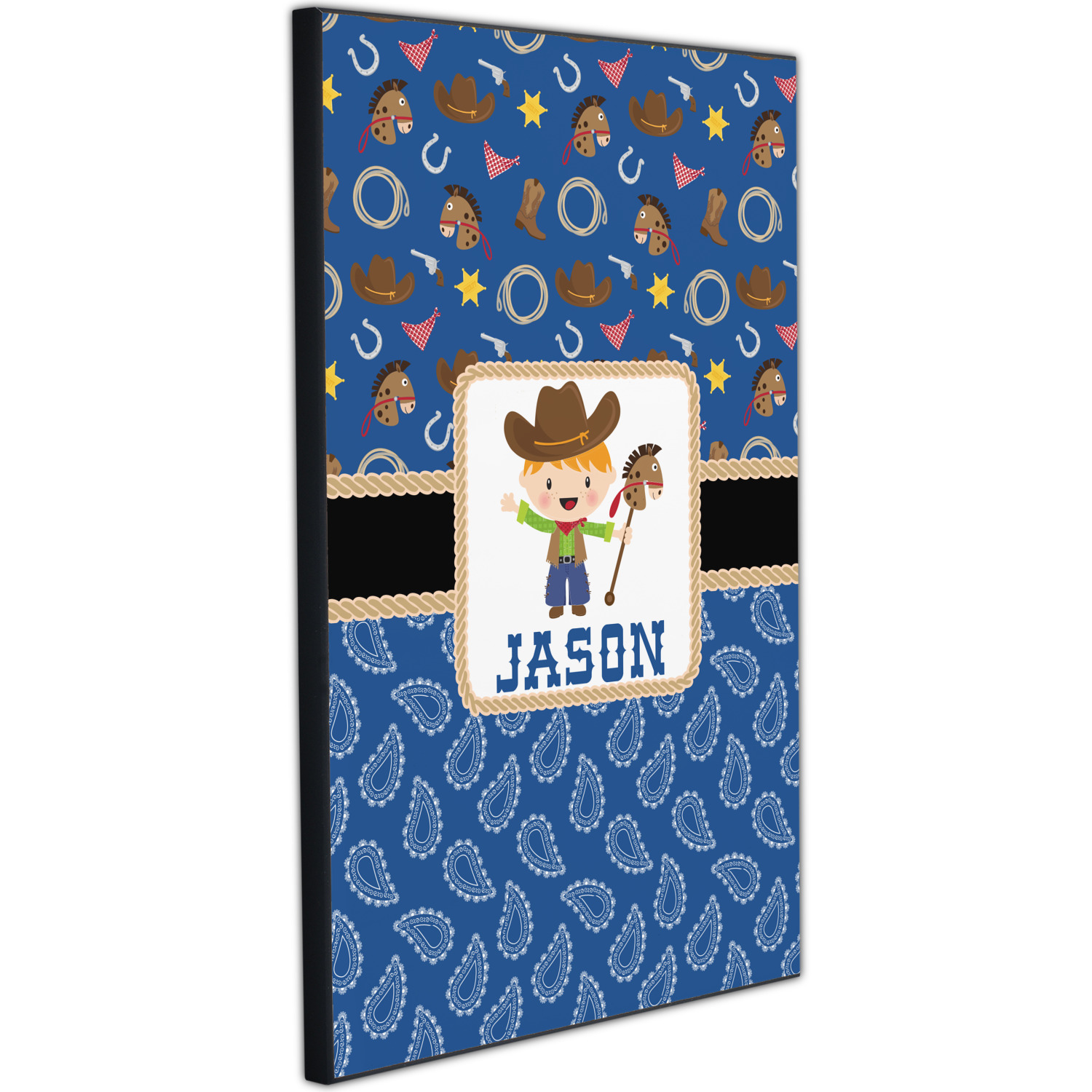 A square label showcasing our cute little cowboy holding his lasso has your little one dreaming of being a cowboy on the range one day.