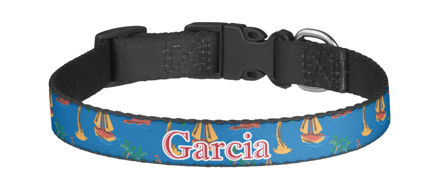 This sturdy collar, made from a durable nylon weave, will outlive your dog's episodes of excited tugging and pulling. Courtesy of its thick plastic buckle and adjuster, this collar is adjustable and accommodating of any dog. Structurally, the collar is a single piece of nylon weave that is sewn together, and features a solid metal loop where you can attach a leash or dog tag. We print and display your dog's name and pattern across the middle of the personalized dog collar.